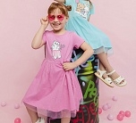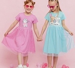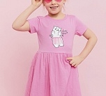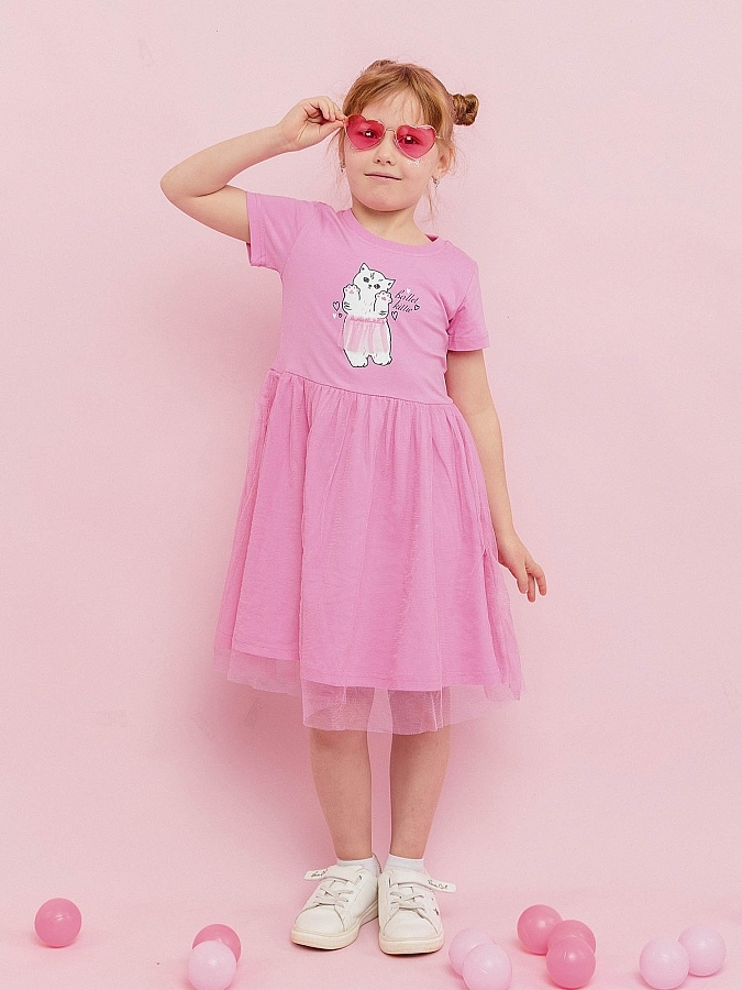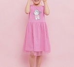 Платье для девочки розовое трикотажное из супрема пенье. Платье летнее с коротким рукавом из мягкой ткани супрем пенье. На груди симпатичный рисунок в виде котика. Юбка длинная двухслойная с верхним слоем из сетчатой ткани.