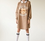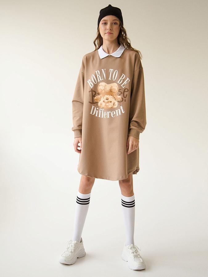 Платье с длинным рукавом бежевое для девочки подростка. Выполнено из футера премиального качества с добавлением полиэстера. Подойдет как на осень, так и на зиму. Рукава с эластичными манжетами, крой свободный, длина до колена. Спереди принт в виде надписей и перевернутого мишки.