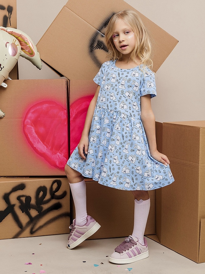 Платье для девочки из натурального хлопка с милыми зайчиками. Нежный принт – трогательные зайчики создают игривое и милое настроение. Гипоаллергенная дышащая ткань, безопасная для нежной детской кожи. Свежий летний цвет, идеально подходящий для теплого сезона. Свободное платьице с короткими рукавами не сковывает движения. Отлично сочетается с сандалиями, балетками или легкими кедами. Идеальный выбор для прогулок, детского сада и особых случаев. Удобная длина для активных игр.