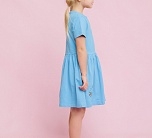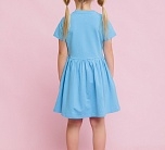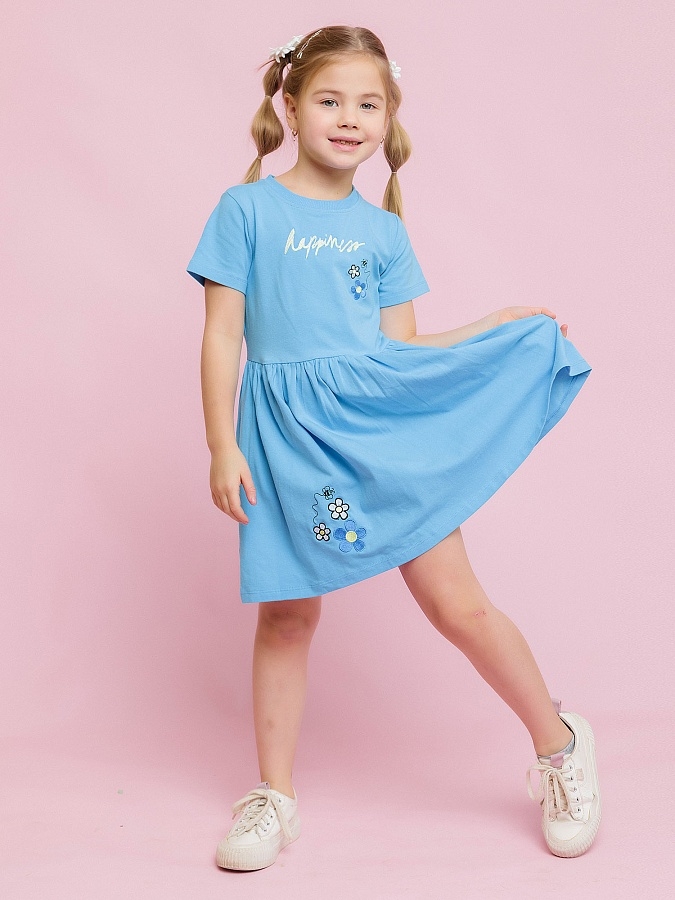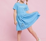 Платье с коротким рукавом для девочек в голубом цвете с вышивкой и надписями на груди и подоле. Лёгкое летнее платье из набивного трикотажа супрем. Cтильное, яркое и модное платье выполнено из высококачественного хлопка.