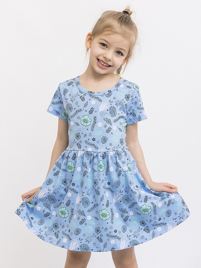 Платье с коротким рукавом в голубом оттенке для девочки из натурального хлопка. Мягкая, дышащая ткань, нежная к детской коже. Милый весенний принт. Удобная горловина - широкая округлая форма не натирает шею. Нежный цвет - идеальный оттенок для маленьких модниц. Свободный крой для комфорта в течение всего дня. Короткие рукава - идеально для теплой погоды.