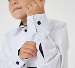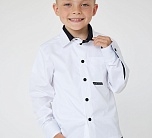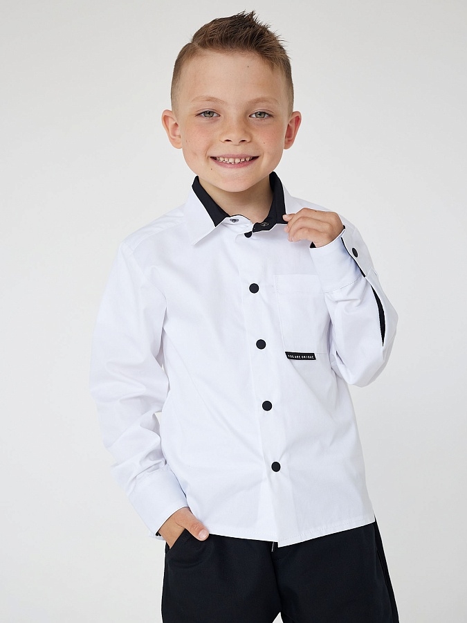 Приталенная рубашка белого цвета для мальчика с длинным рукавом, нагрудным карманом и контрастной отделкой. Застежка на пуговицы. Нашивка на кармане.