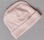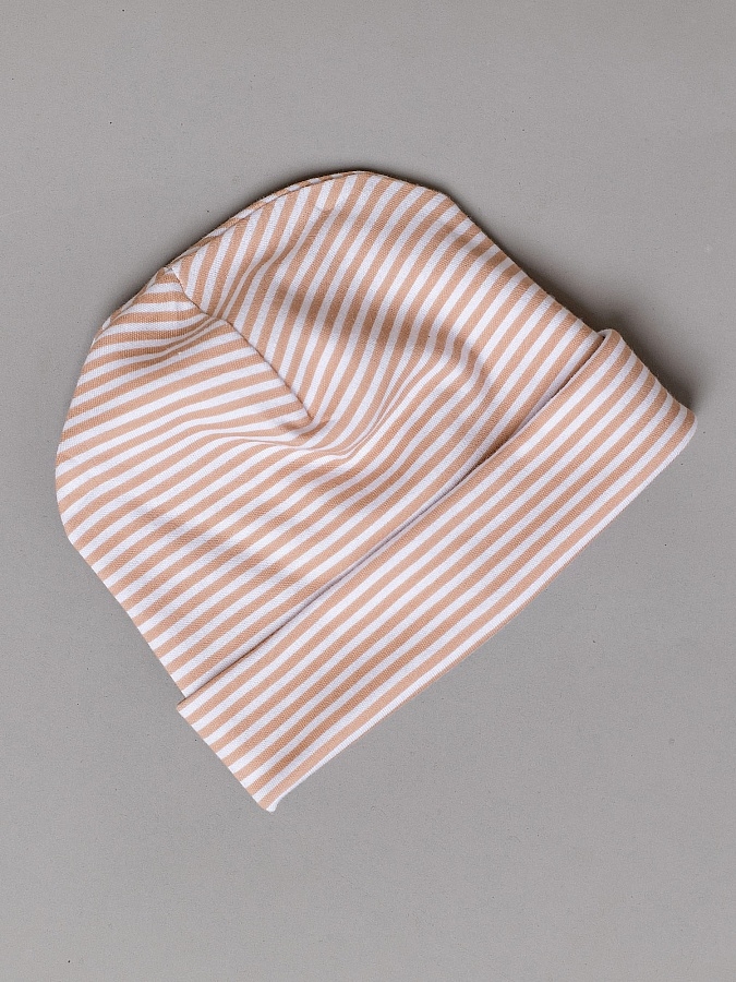 Шапочка для новорожденных в полоску бежевая с отворотом. Шапка однослойная из 100% хлопка. В трикотажной шапочке нежная кожа головы малыша прекрасно дышит, и в то же время защищена от ветра.