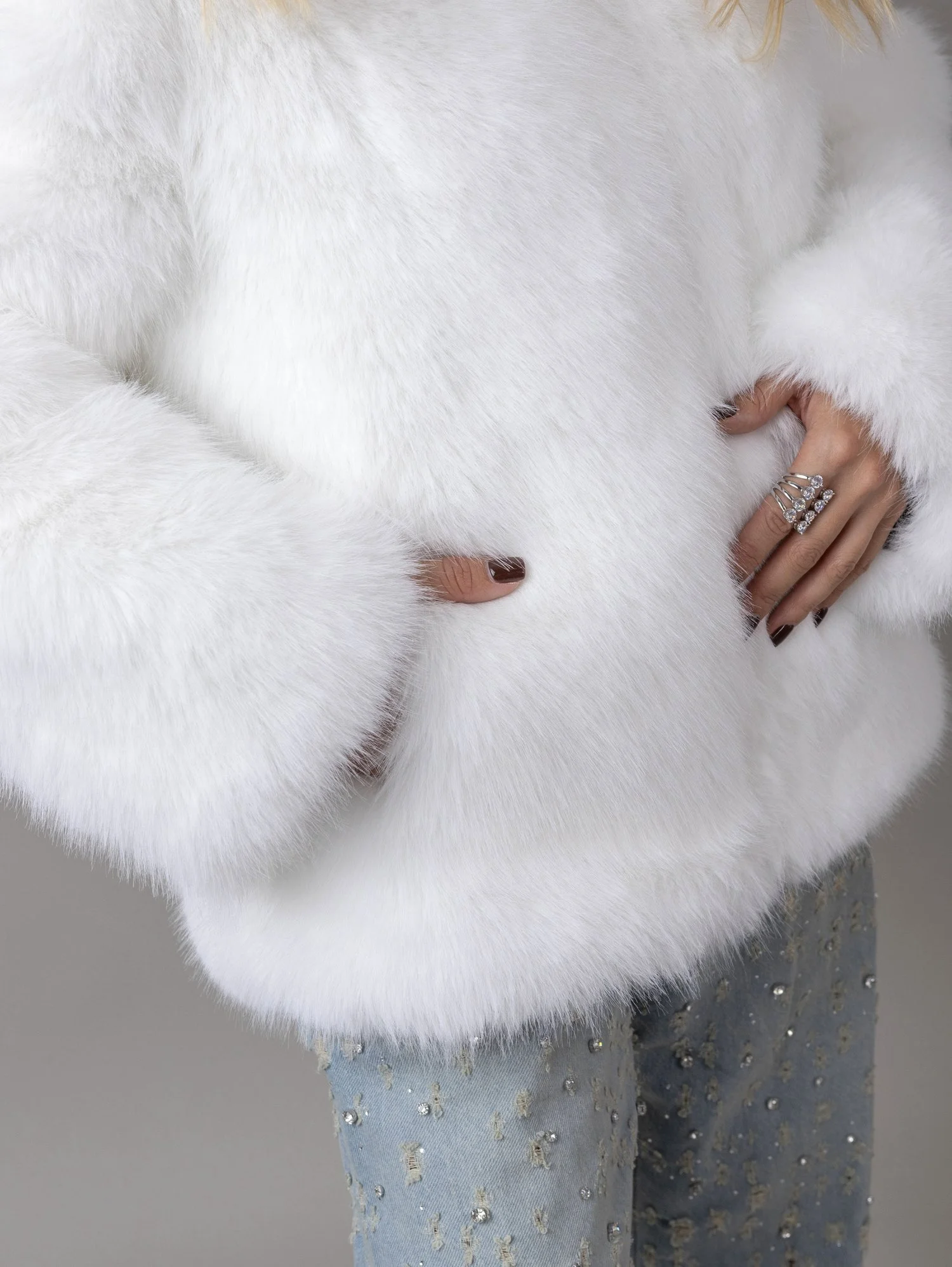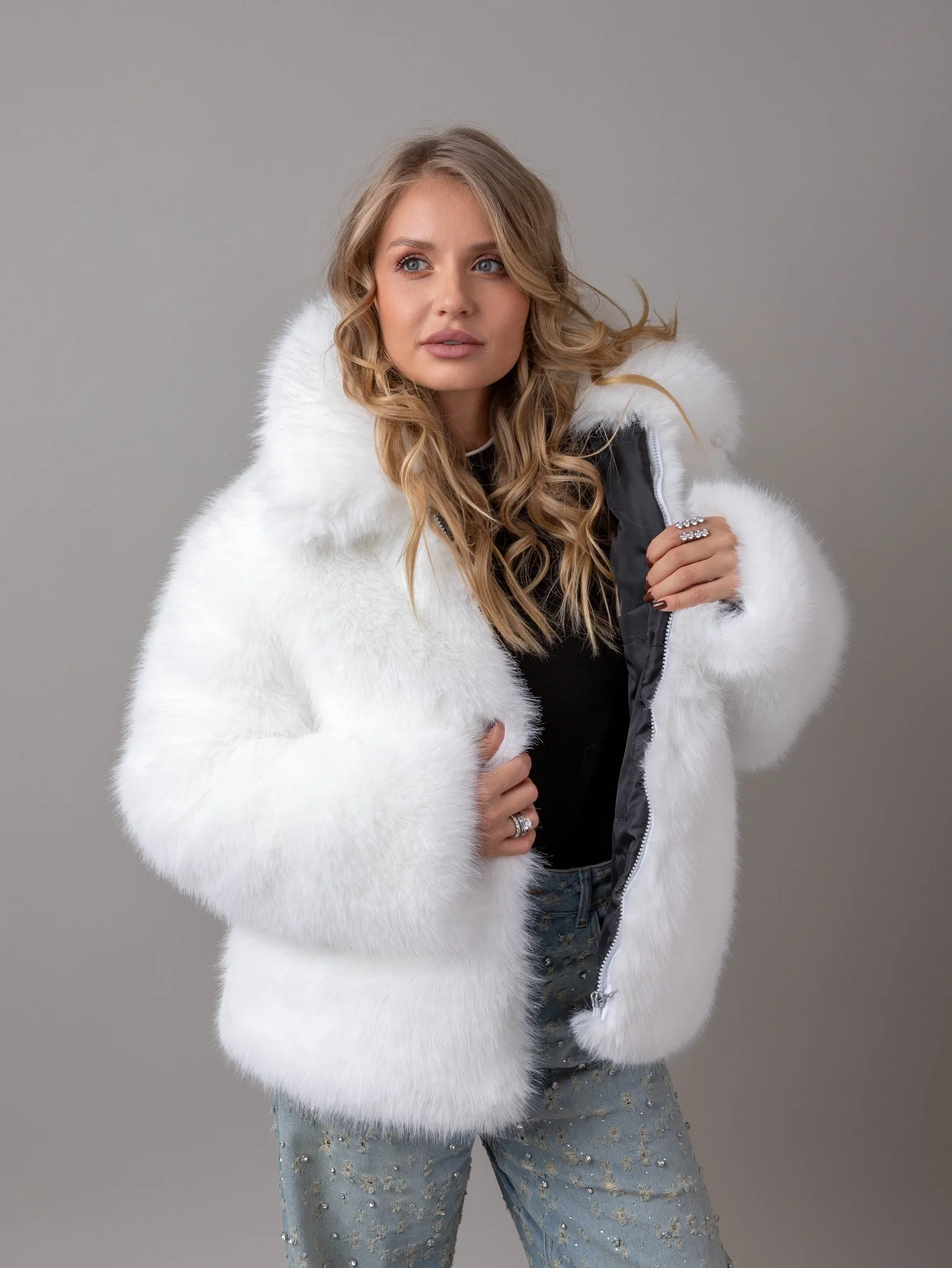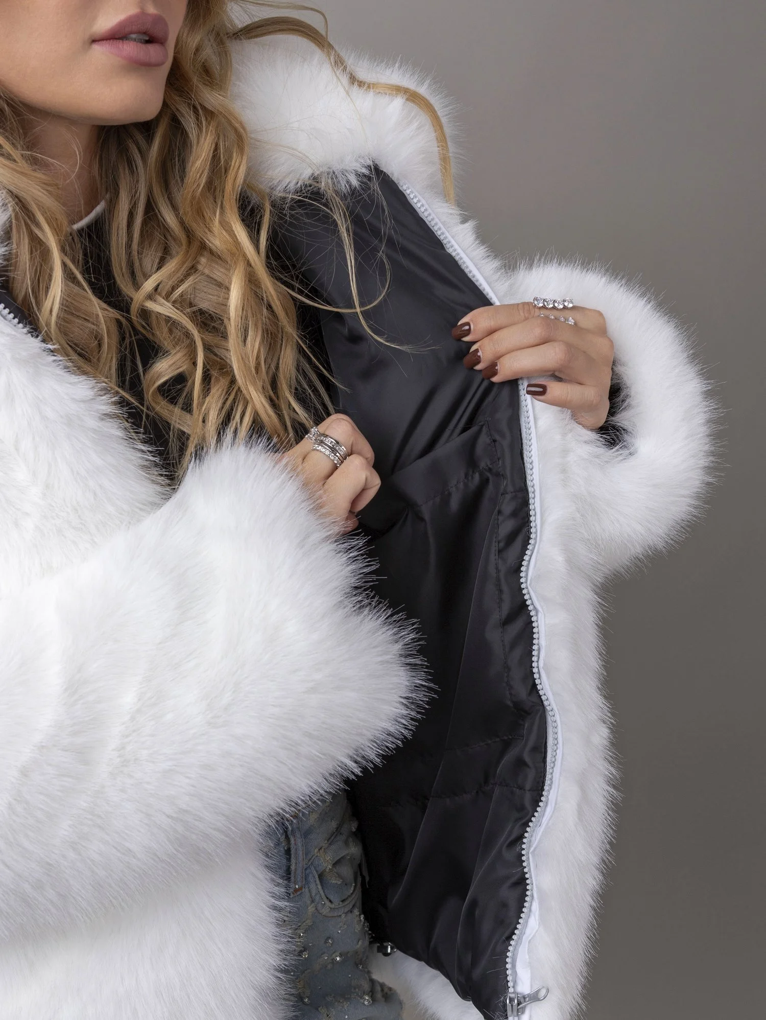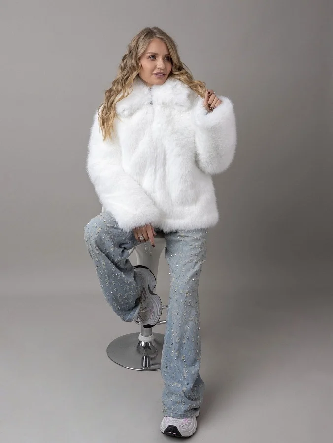 Шуба белая до бедер сочетает в себе утонченный дизайн и продуманную функциональность. Центральная застежка-молния обеспечивает удобство использования, а воротник стояче-отложного типа предлагает вариативность в создании образа: его можно носить как классической стойкой, так и мягко отложить. Дополнительная застежка на пуговицу у горловины надежно защищает от ветра и холода. Практичность модели подчеркивают удобные прорезные боковые карманы с теплой подкладкой, где руки будут надежно защищены от мороза. Элегантный силуэт, качественные материалы и внимание к деталям делают эту шубу идеальным выбором для городских прогулок и деловых встреч в холодное время года.