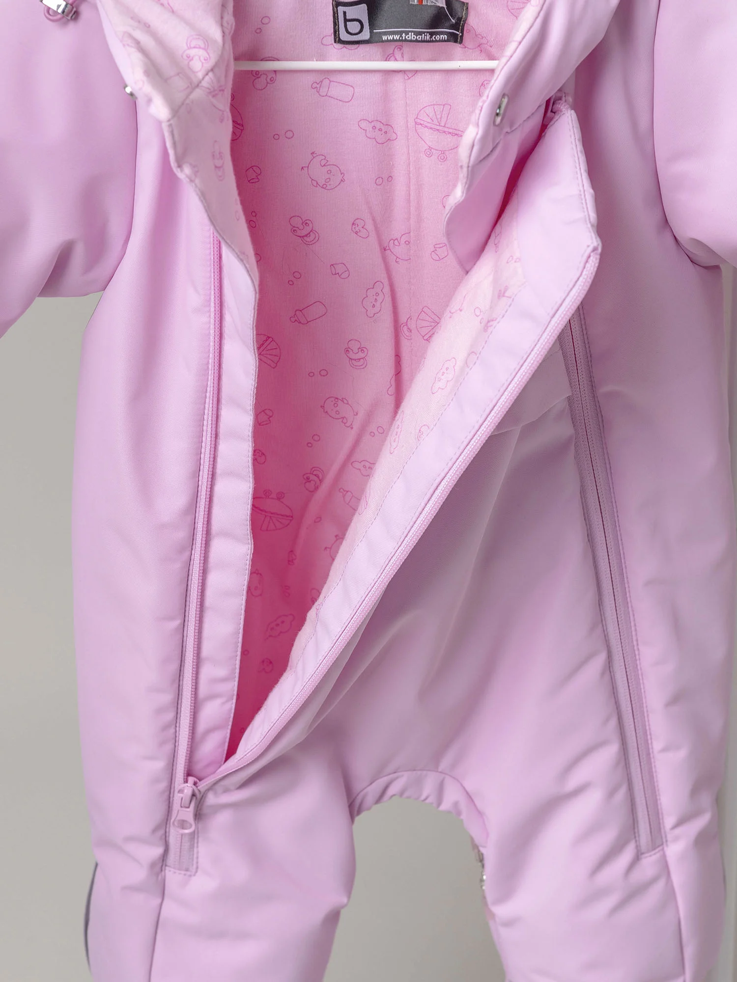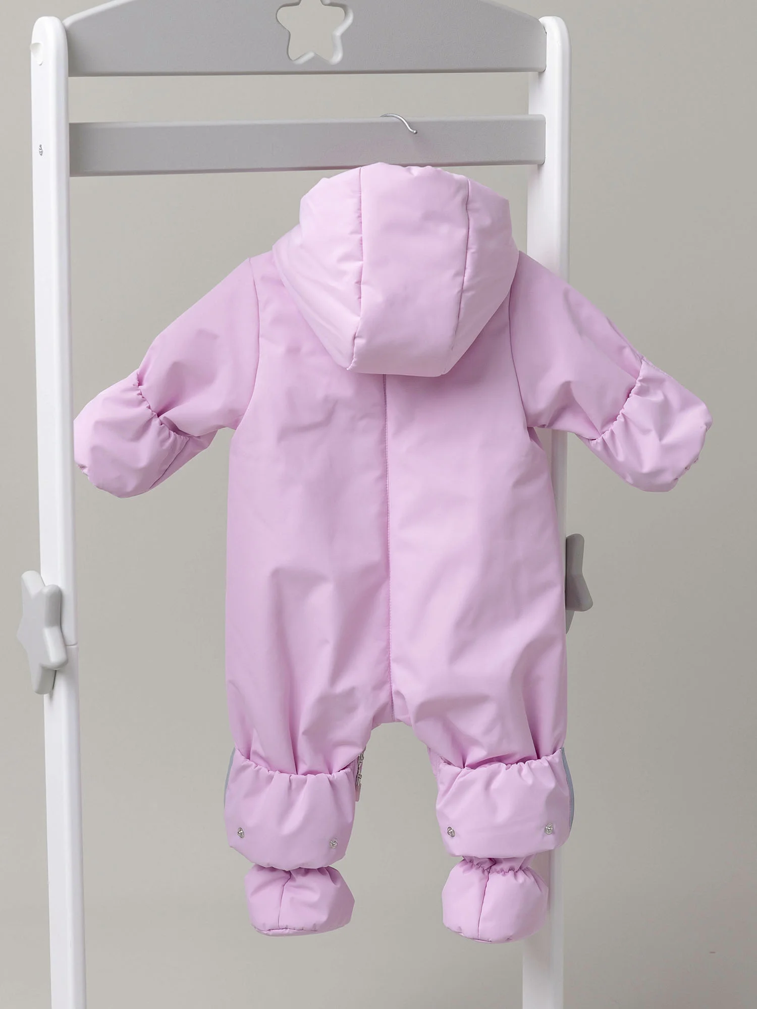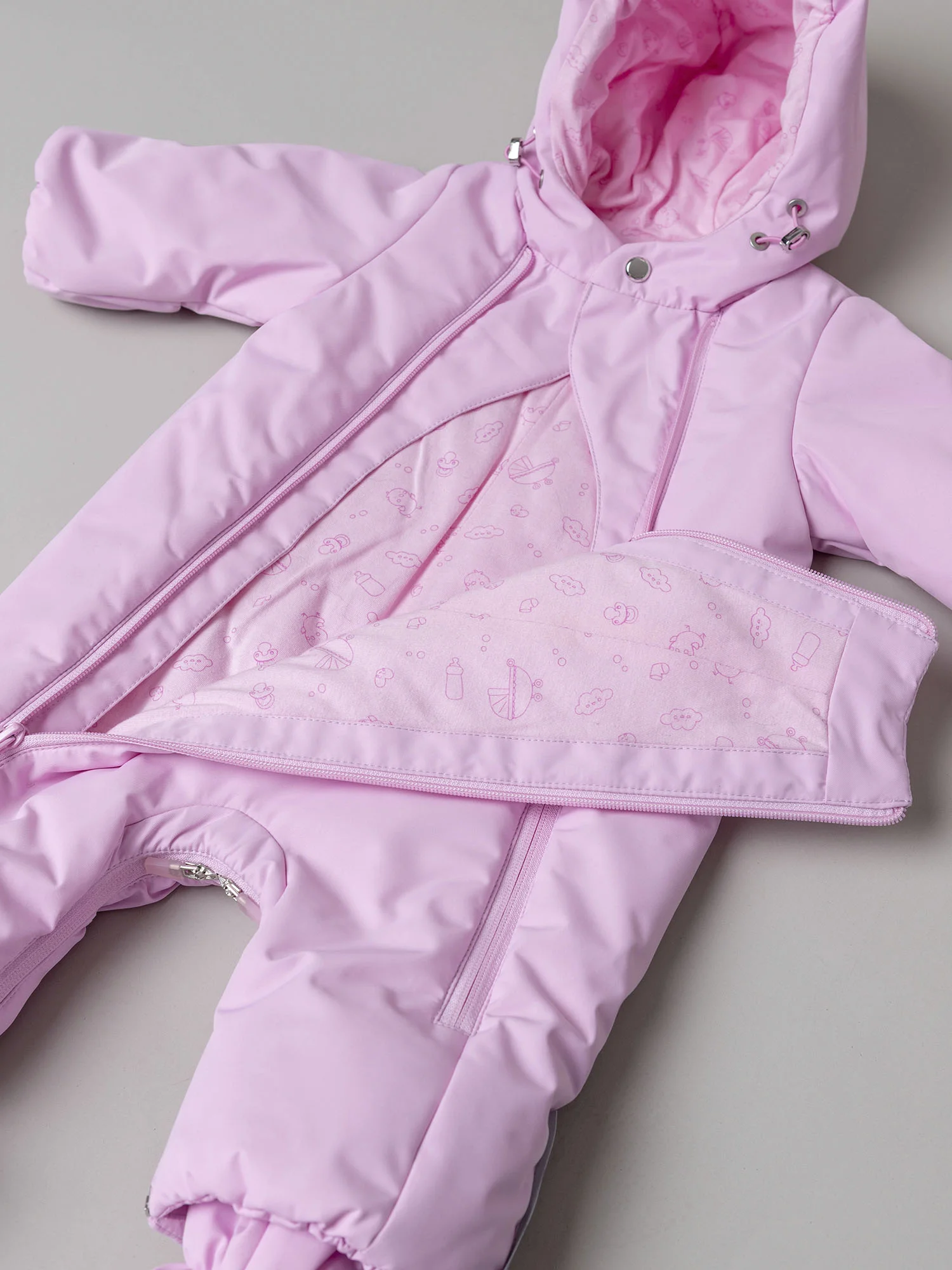 Модель оснащена двумя центральными молниями и молнией для трансформации в конверт с двумя бегунками, которые фиксируются в нужном положении. Кулиса по лицевой части капюшона позволяет регулировать объём и защищает от ветра, а ветрозащитная планка на кнопках и защита подбородка делают комбинезон особенно практичным. Подойдёт для прогулок и выписки.