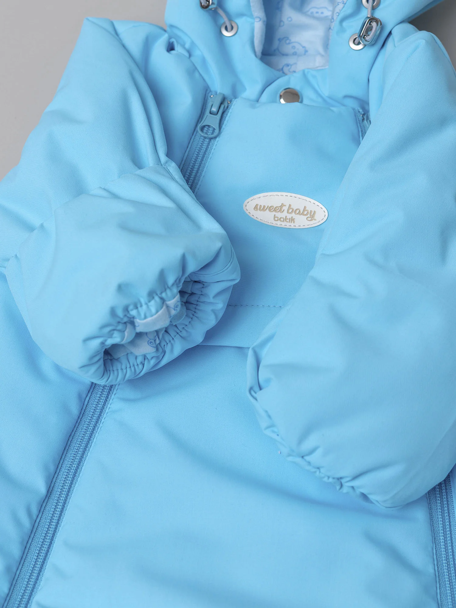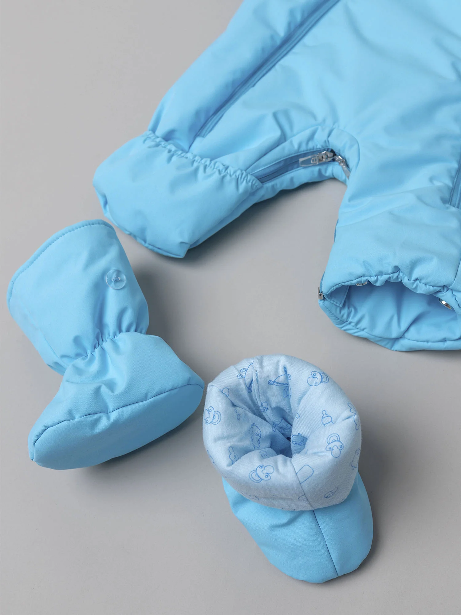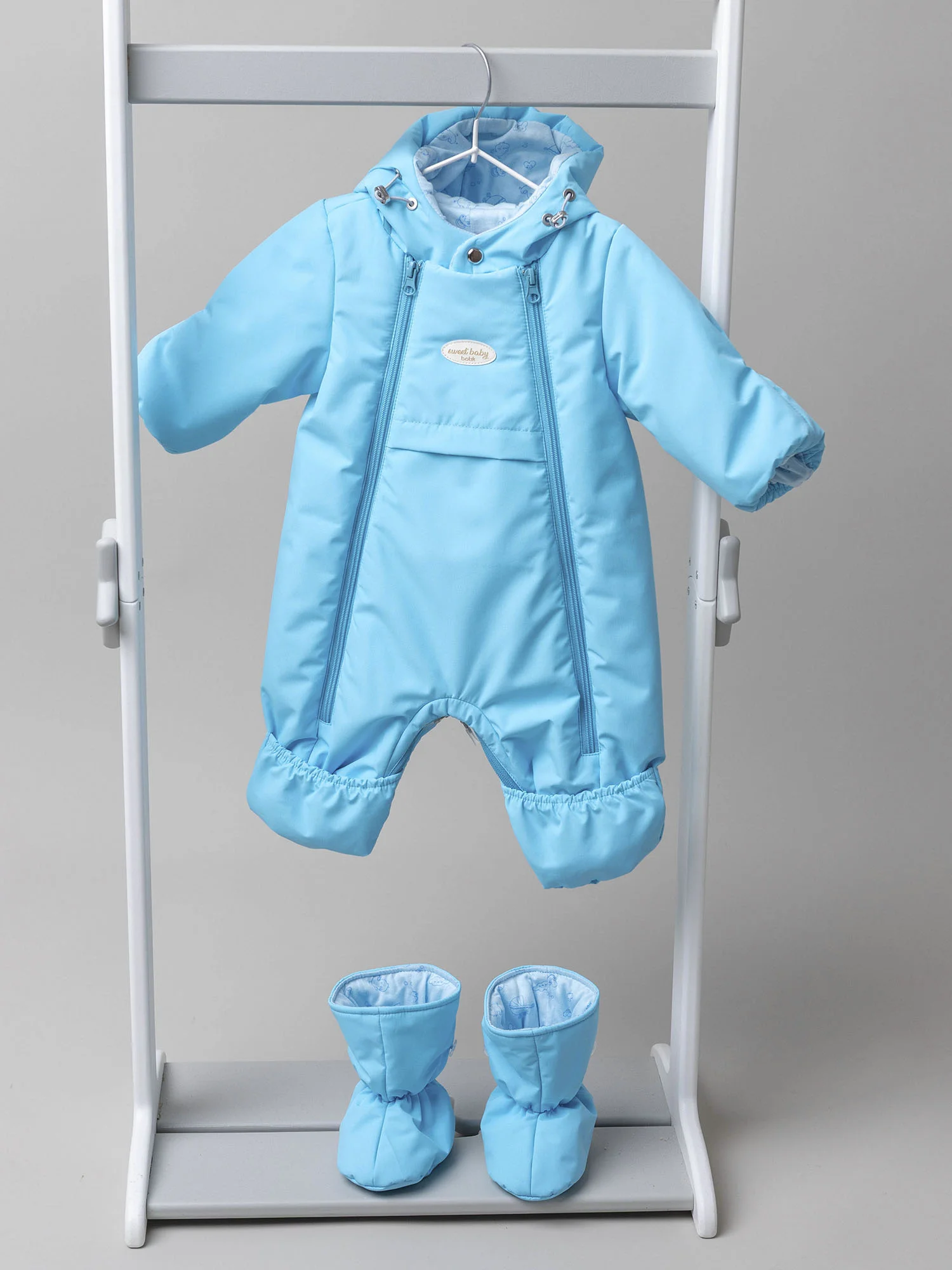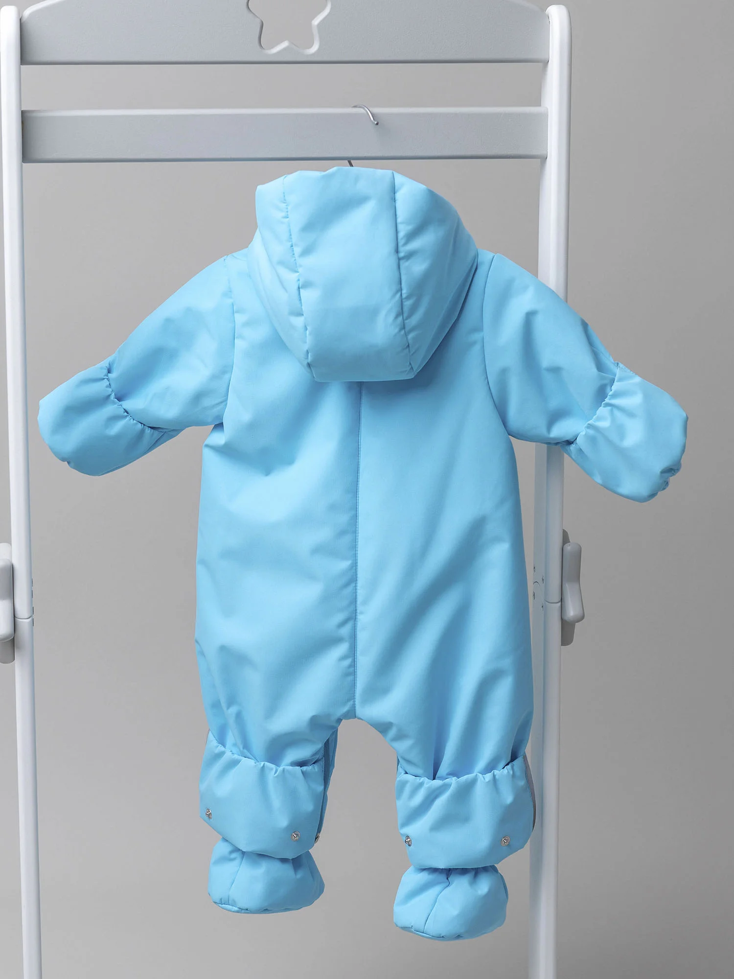 Модель оснащена двумя центральными молниями и молнией для трансформации в конверт с двумя бегунками, которые фиксируются в нужном положении. Кулиса по лицевой части капюшона позволяет регулировать объём и защищает от ветра, а ветрозащитная планка на кнопках и защита подбородка делают комбинезон особенно практичным. Подойдёт для прогулок и выписки.