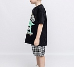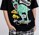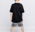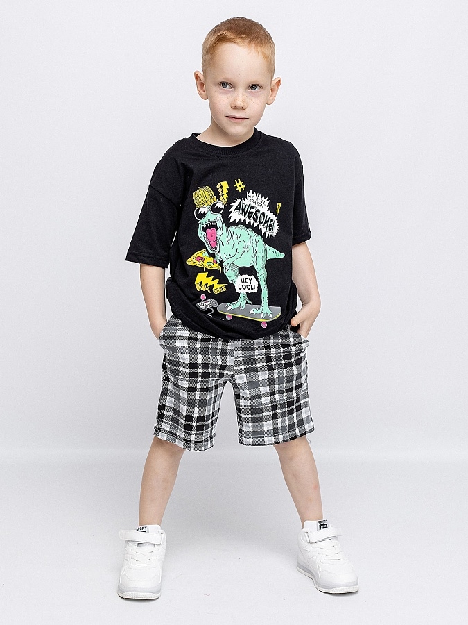 Комплект для мальчика трикотажный: футболка с коротким рукавом + шорты. Футболка черная с ярким принтом в виде динозавра и надписей. Шорты с карманами в клетку. Универсальный комплект для дома и улицы. Удобный и комфортный комплект выполнен из высококачественного хлопкового трикотажа.