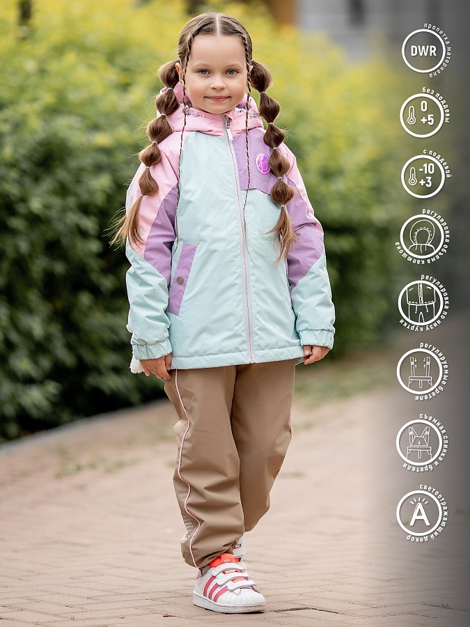Стильный комплект для девочки Ника в нежной голубо-розовой расцветке. Смелое сочетание цветов в комплекте с брюками-джоггерами отлично вписываются в городской стиль. Регулировка объема капюшона и по низу куртки защитит от ветра, а мембранная ткань с водоотталкивающей пропиткой от влажной погоды. Комплект дополнен светоотражающим декором.