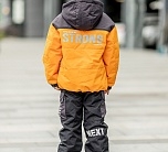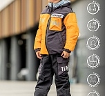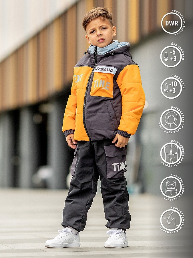 Комплект для мальчика Месси демисезонный в черно-желтом цвете. Куртка и брюки из прочной мембраны с водотталкивающей пропиткой. Куртка в стиле бомбер с капюшоном и эластичными манжетами. Брюки с элементами карго. Утеплитель слайтекс и флисовый подклад.