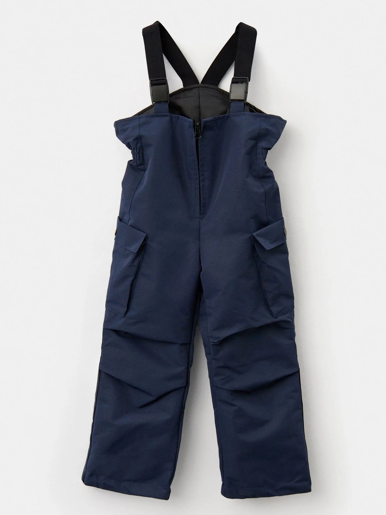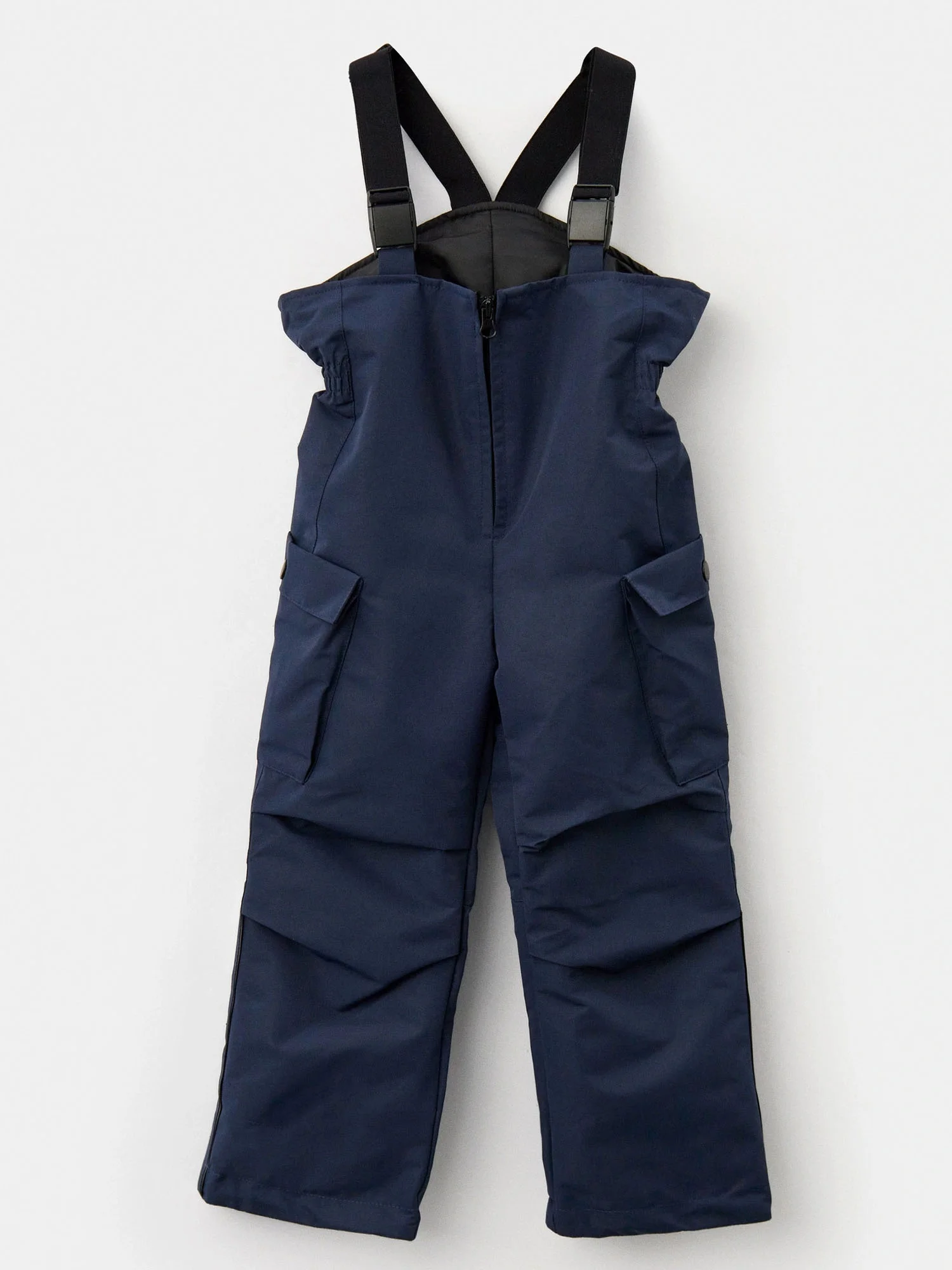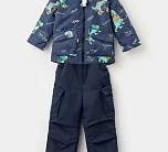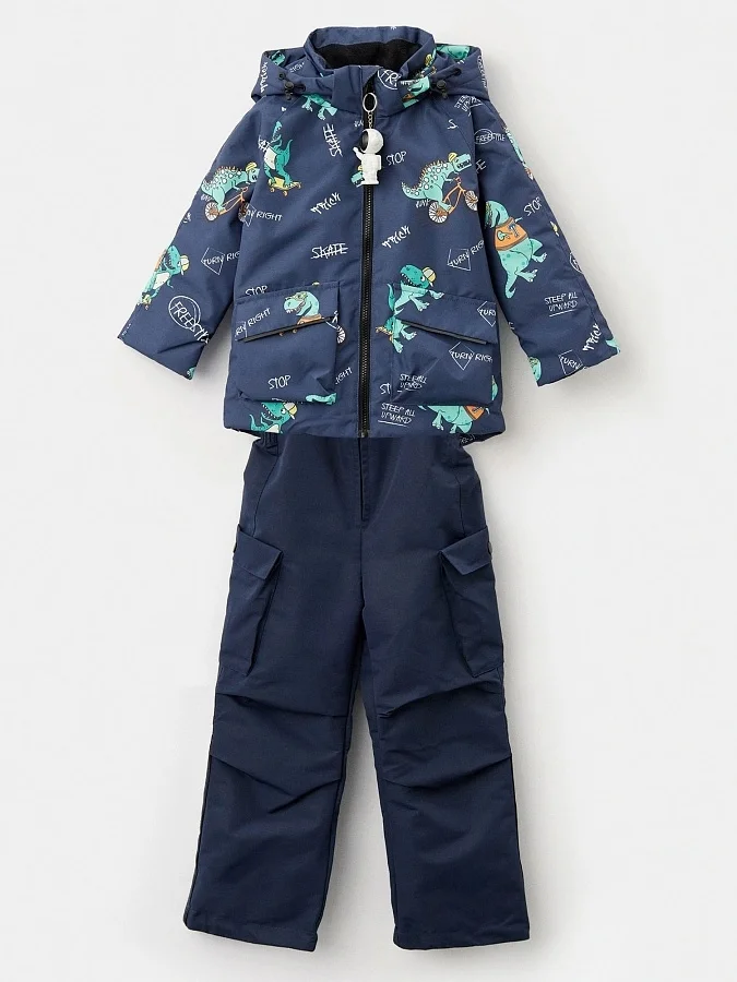 Удлиненная спинка имеет фигурный низ. Съемный капюшон крепится к отлету воротника, оснащен кулисой по лицевой части. Низ куртки можно регулировать по ширине, а рукава имеют мягкую форму реглан. Полукомбинезон-карго эргономичного кроя дополнен складками в области колена, съемными регулируемыми бретелями и кулисой в эластичном поясе.
