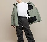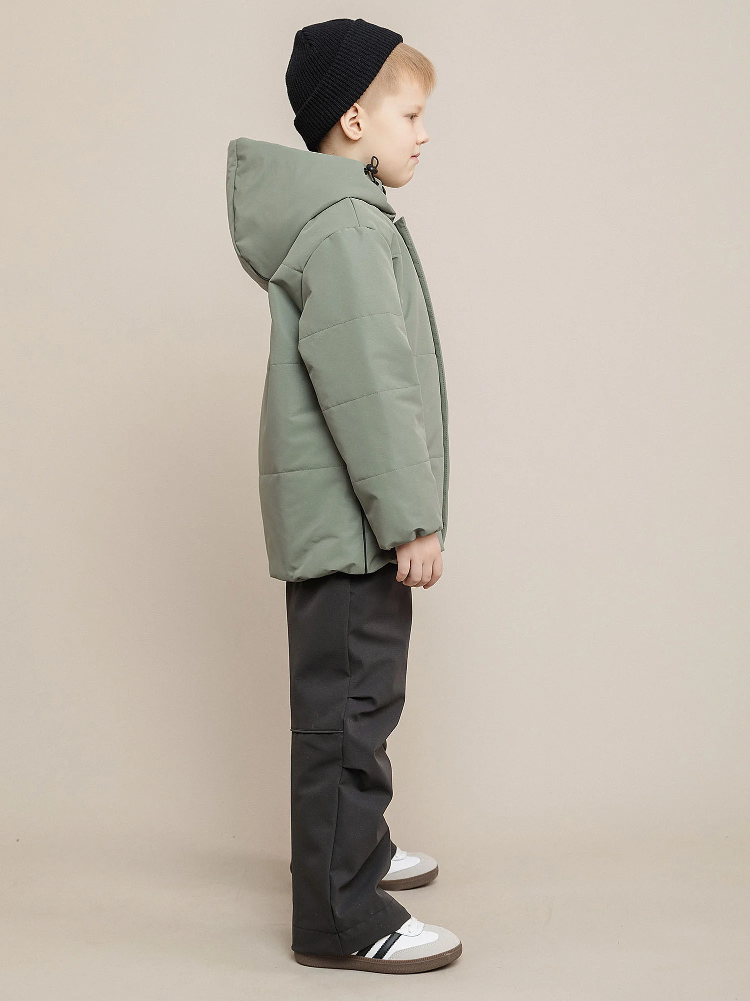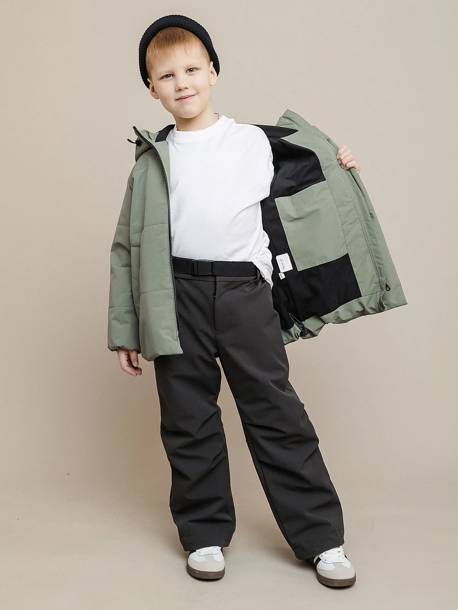 Брюки с регулировкой по низу на резинку позволяют создать силуэт джоггеров или прямых брюк. Застёжка на молнию и кнопку, задняя часть пояса на резинке, пояс с шлевками и эластичным ремнем. Боковые карманы, защипы на уровне колен для свободы движений, кокетка и подрезы на задней половинке. Светоотражающие элементы — канты и нашивки — повышают безопасность ребёнка в тёмное время суток.