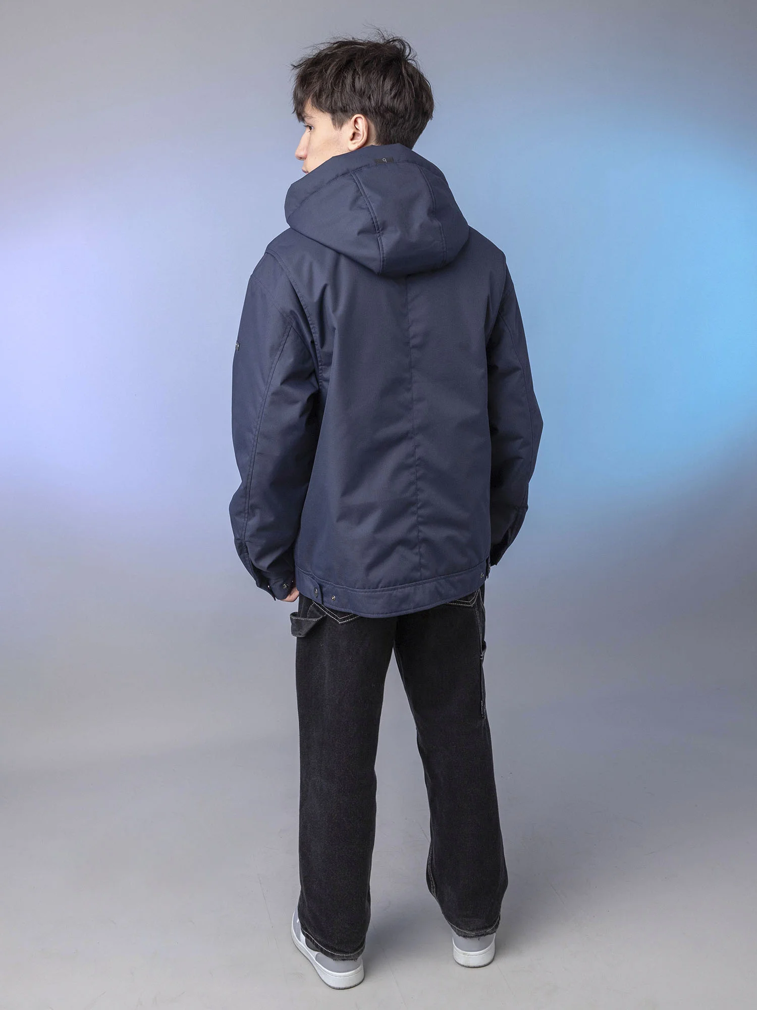 Подклад комбинированный: спинка из ворсового трикотажа, остальная часть из гладкой таффеты. Внутренние карманы: один на молнии, второй накладной на велкро. Светоотражающие элементы — нашивка на левом рукаве и патч в подарок — обеспечивают безопасность ребёнка в тёмное время суток.