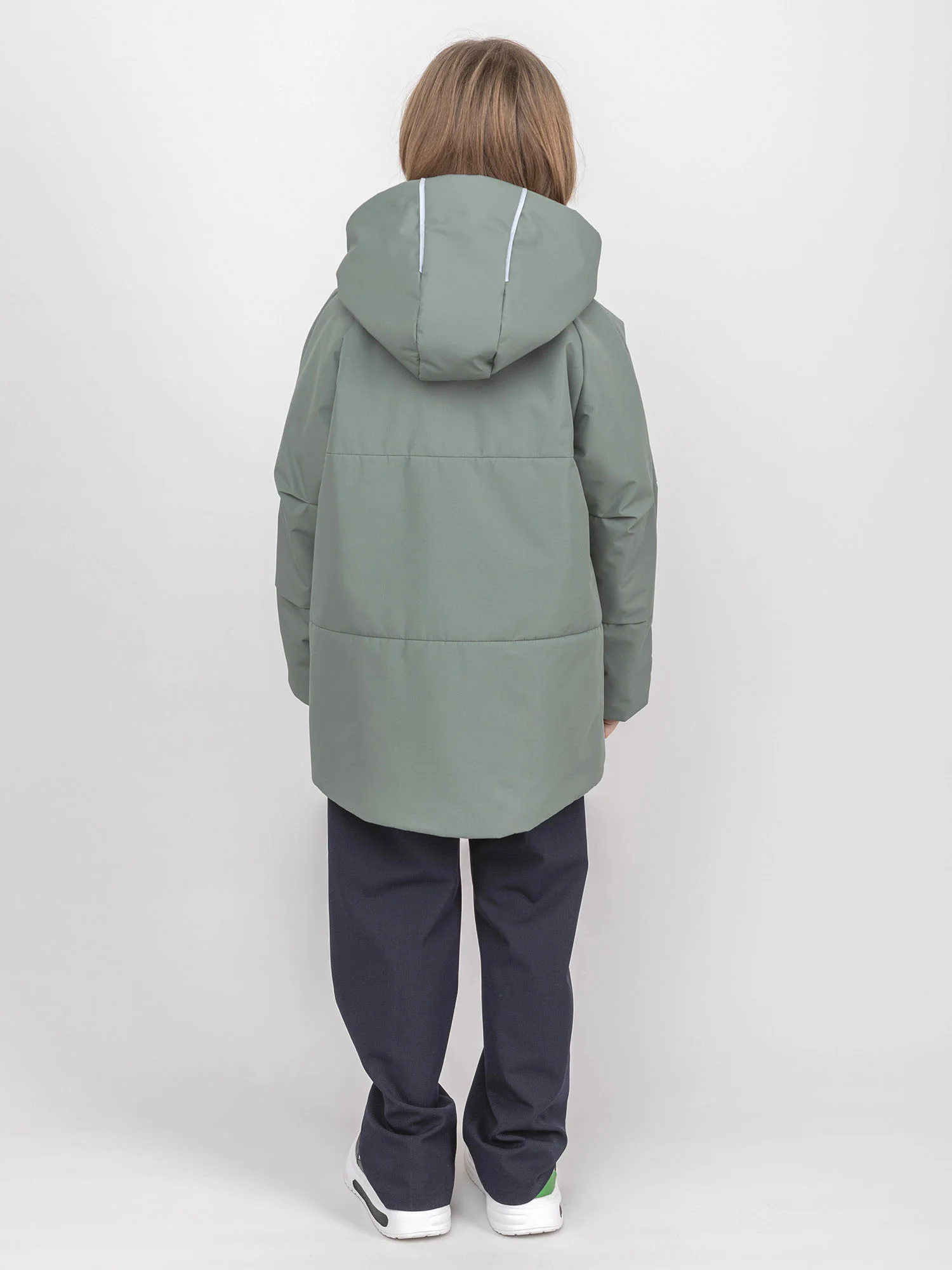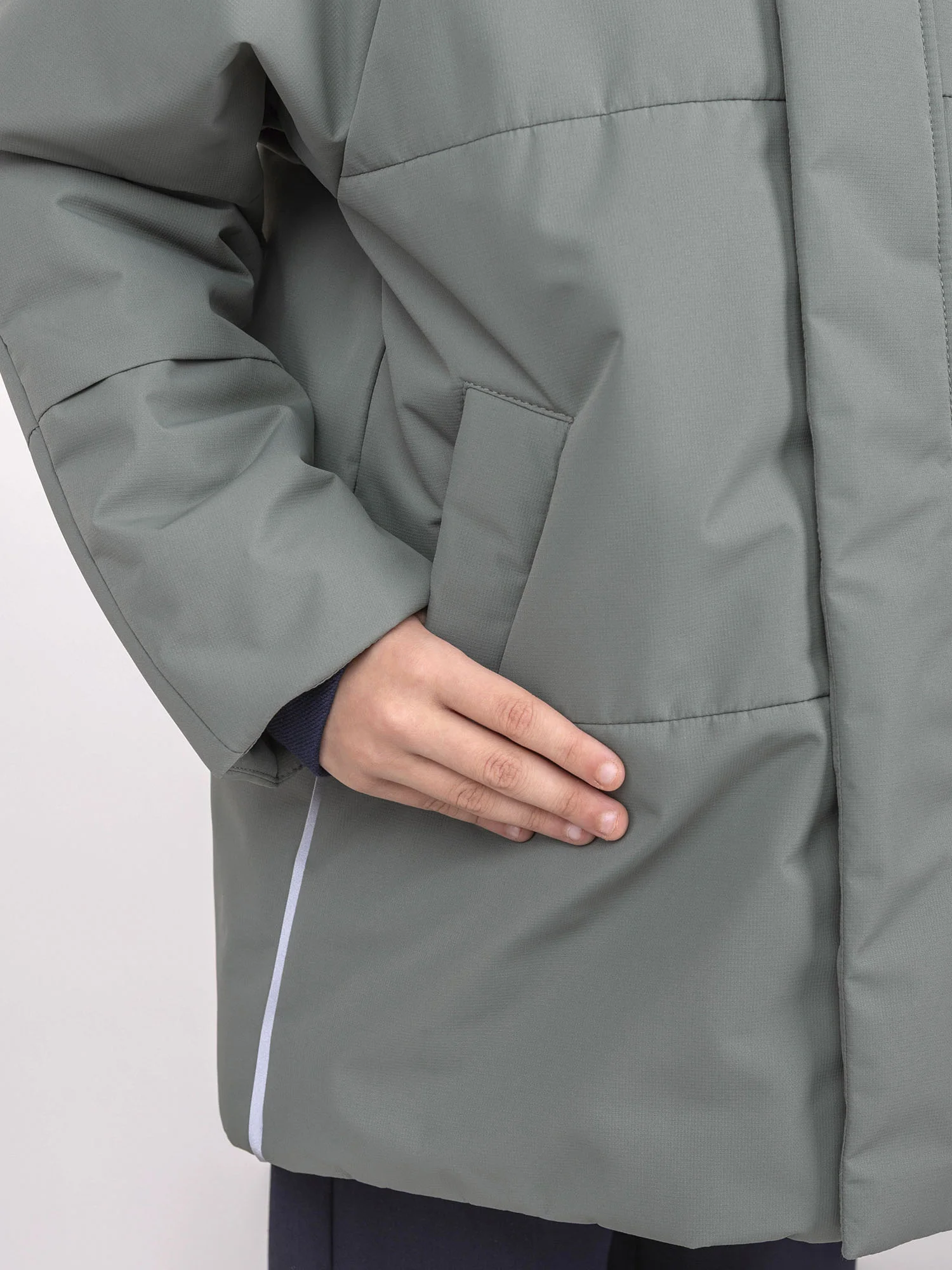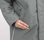 Вместительные карманы по бокам, эластичная тесьма на рукавах для плотного прилегания и защиты от поддува. По низу изделия — утяжка с помощью шляпной резинки и фиксаторов. Высокий мягкий воротник-стойка защищает шею от ветра.