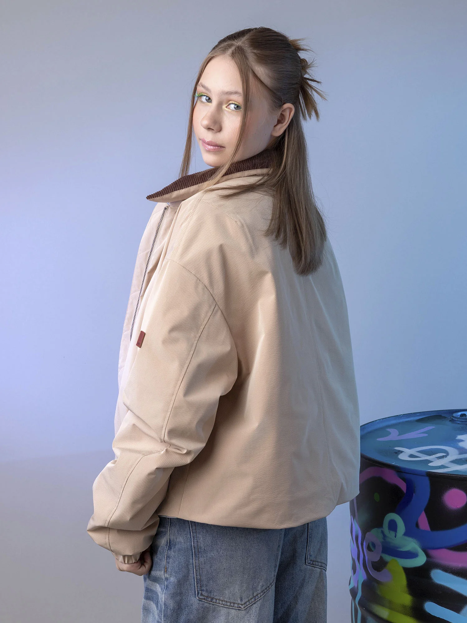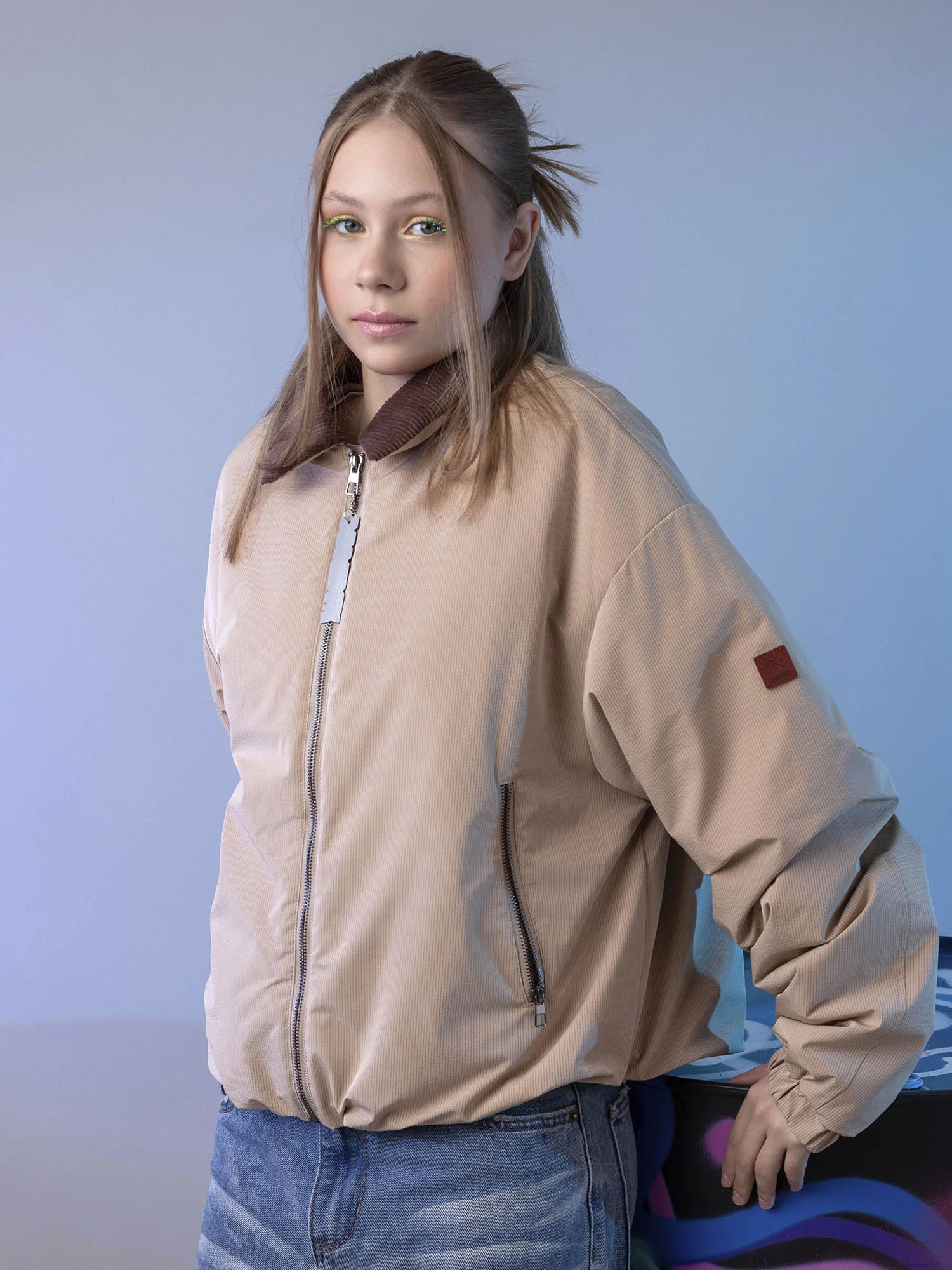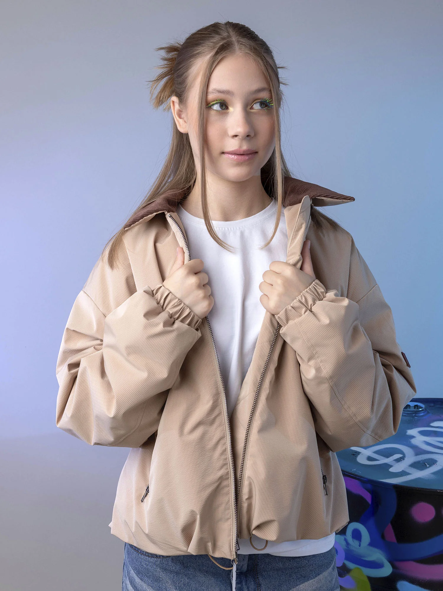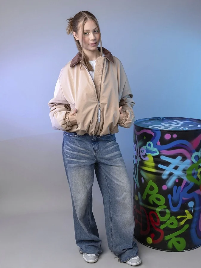 Куртка-бомбер Мирэль — эффектная модель для девочек в актуальном oversize-силуэте. Изделие выполнено из плотной мембранной ткани с необычным визуальным эффектом ворсовой поверхности, которая придаёт куртке выразительный и современный вид.