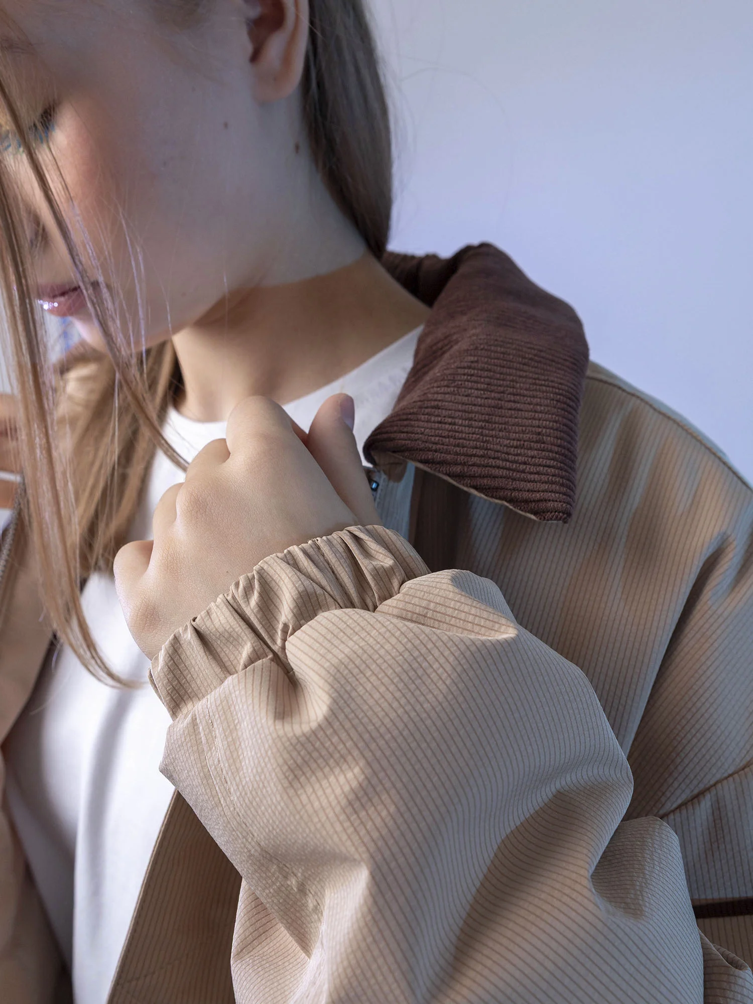 Модель оснащена центральной металлической молнией с внутренней ветрозащитной планкой. Стояче-отложной воротник из мягкого ворсового материала контрастного цвета создаёт стильный акцент и обеспечивает дополнительный комфорт. Объёмные рукава с эластичными манжетами не сковывают движений и защищают от поддува.