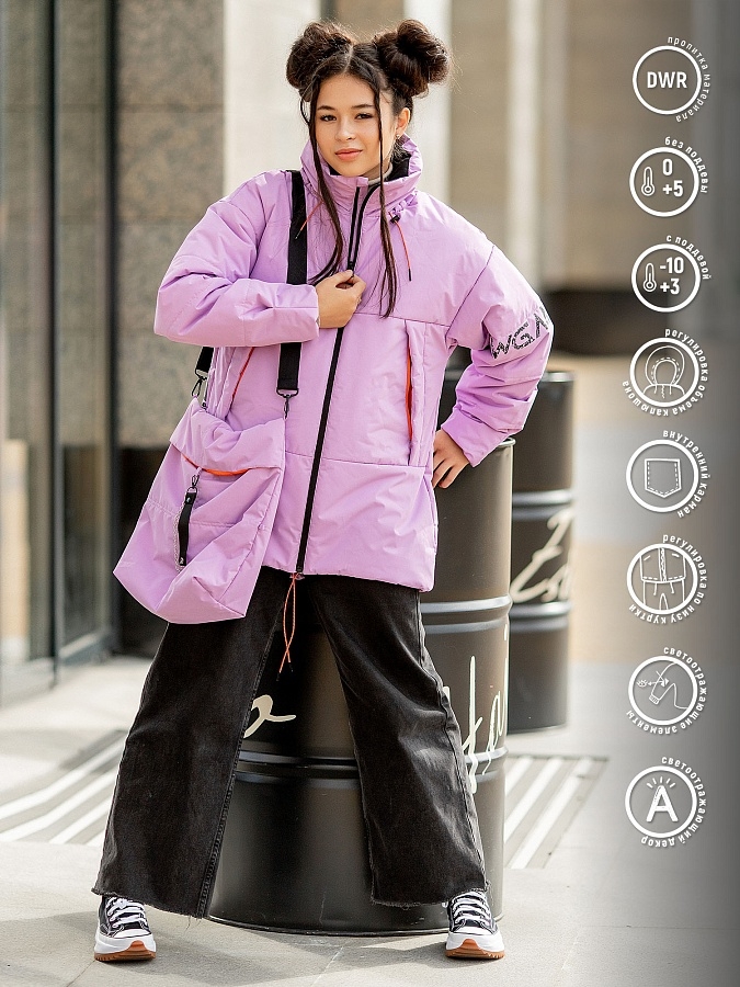 Куртка для девочки Нерис в стиле оверсайз в трендовой сиреневой расцветке . Капюшон-трансформер прячется в воротник, по бокам прорезные карманы на молнии, есть удобный внутренний карман. Сумка-шоппер и ремень стильно дополнят образ.