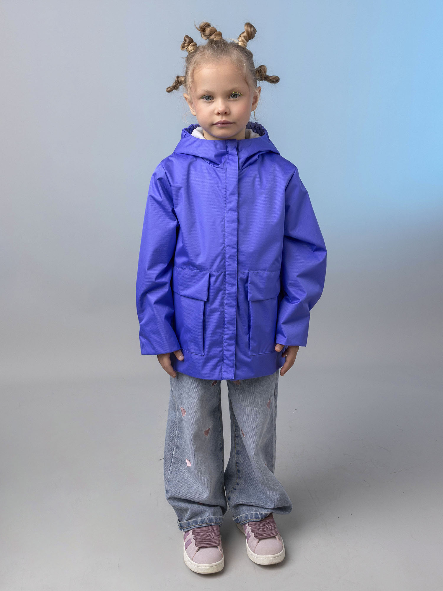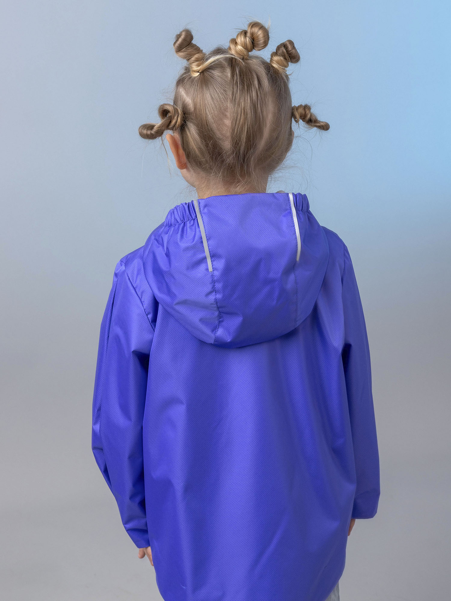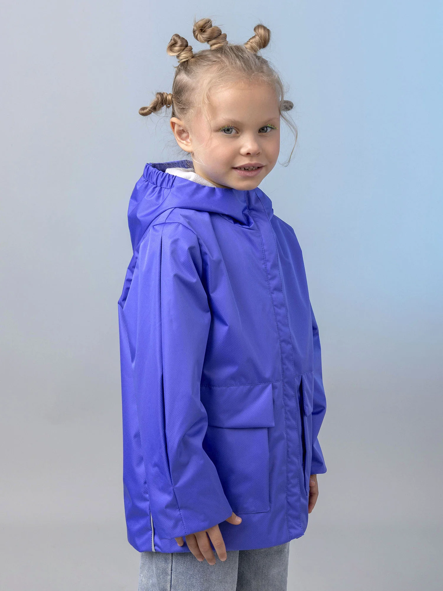 Модель оснащена центральной застёжкой-молнией с защитой подбородка, вместительным карманом под клапаном и капюшоном с утяжкой для регулировки объёма. Светоотражающие элементы повышают безопасность ребёнка в тёмное время суток.