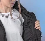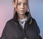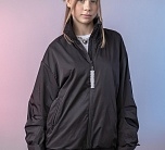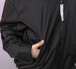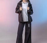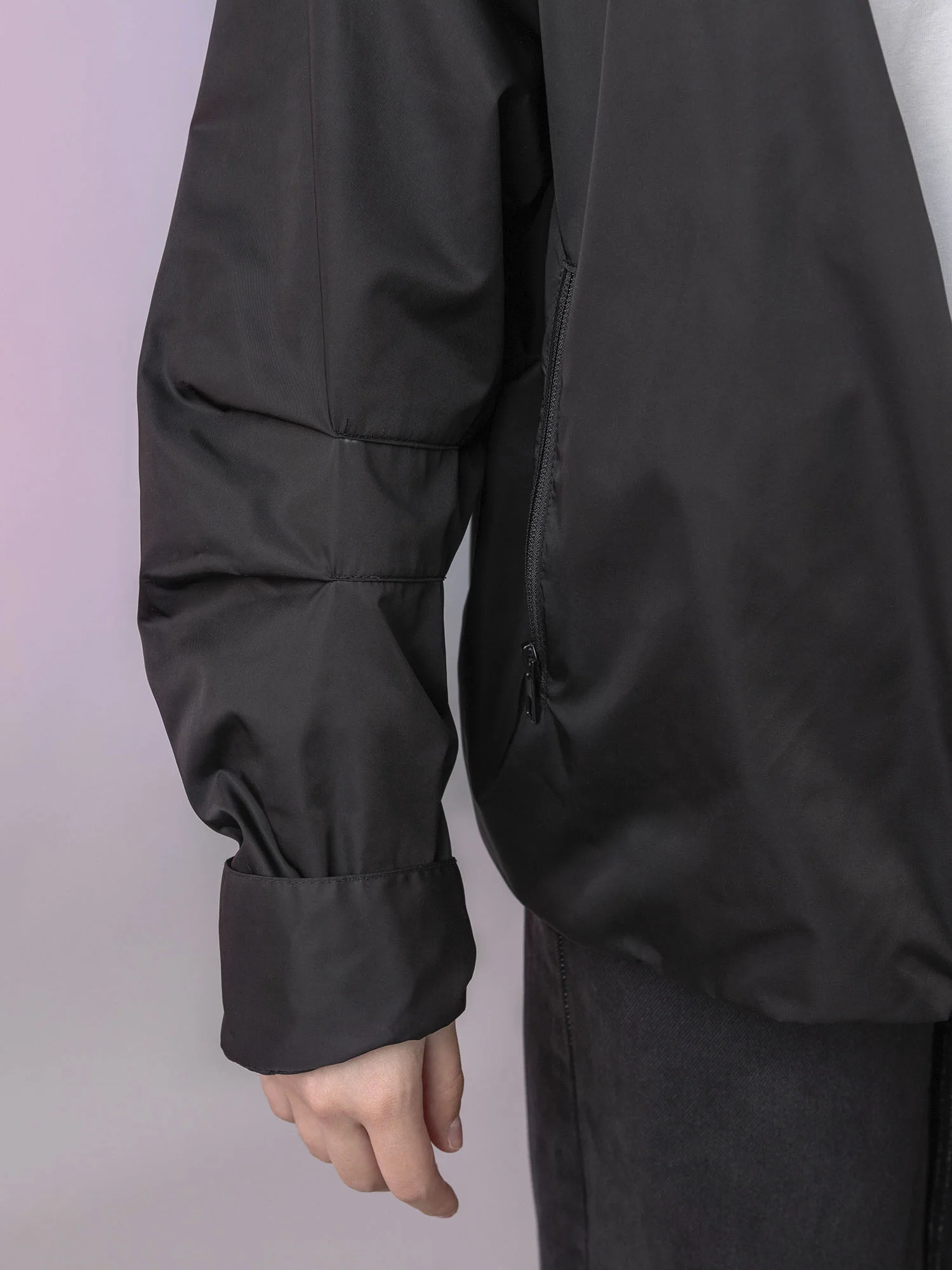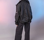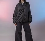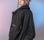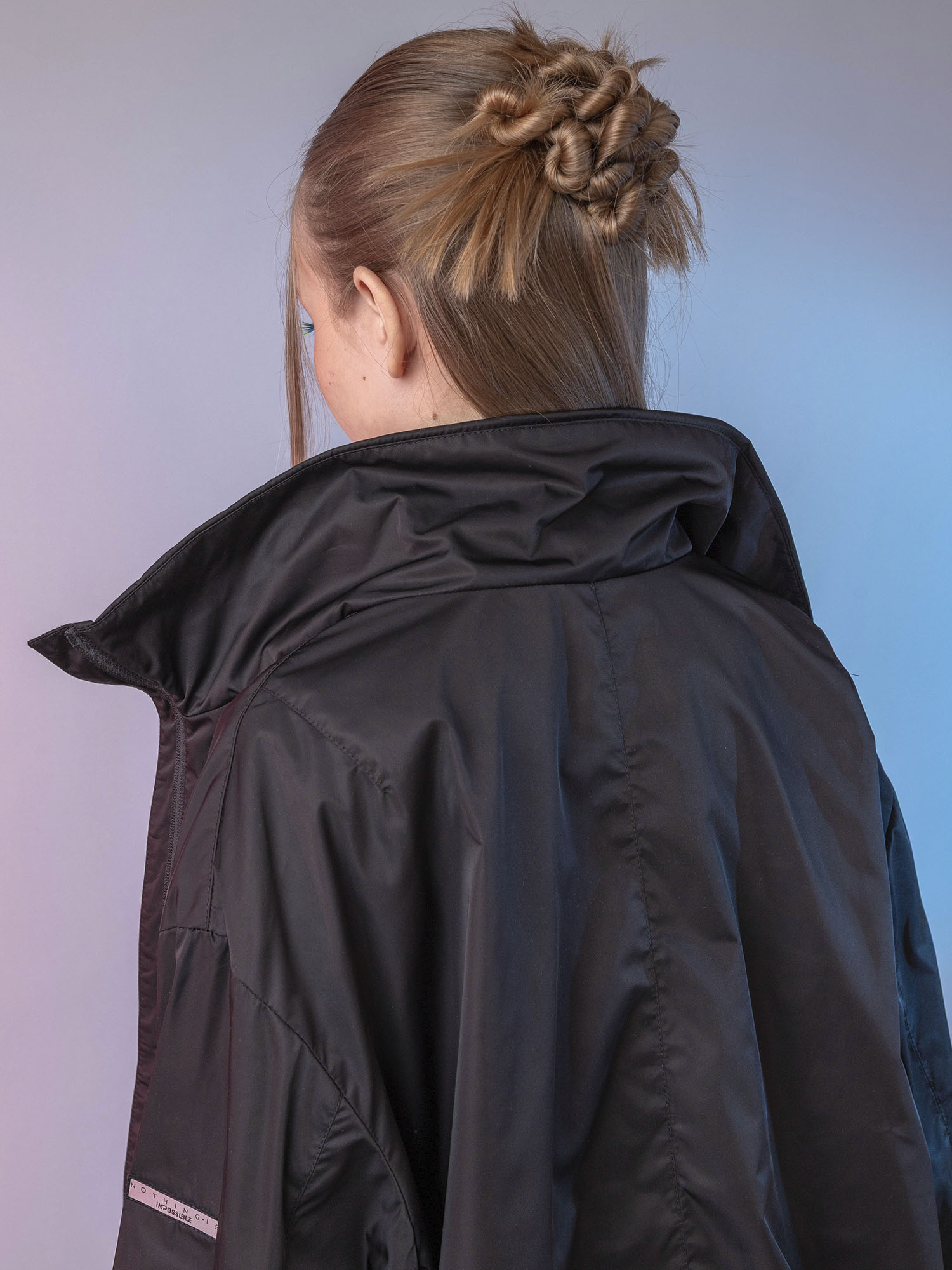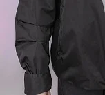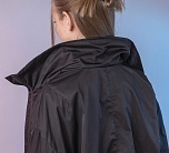 Модель со спущенным плечом и объёмным рукавом с манжетой, регулируемой кнопками. Центральная застёжка-молния, высокий воротник может использоваться как стойка или отложенный вариант. Боковые карманы на молнии и кулиса по низу куртки позволяют регулировать ширину изделия.