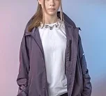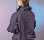 Модель со спущенным плечом и объёмным рукавом с манжетой, регулируемой кнопками. Центральная застёжка-молния, высокий воротник может использоваться как стойка или отложенный вариант. Боковые карманы на молнии и кулиса по низу куртки позволяют регулировать ширину изделия.