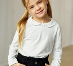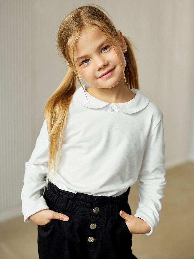 Джемпер для девочки белый с длинным рукавом и отложным воротничком. Детский джемпер из школьной коллекции свободного силуэта. Изготовленный из мягкого трикотажа, этот лонгслив отличается высокой эластичностью и приятной текстурой, обеспечивая комфорт на весь день.