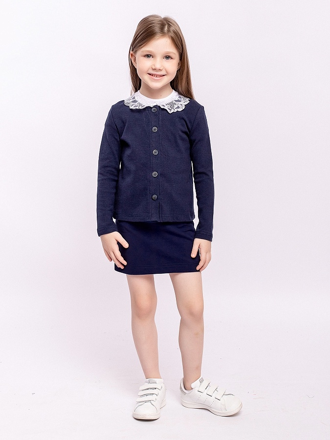 Кардиган для девочки школьный с длинным рукавом в синей расцветке. Кардиган для девочки на пуговицах с длинным рукавом станет альтернативой строгому жакету в школу на осень и весну. Прямой покрой, однотонная расцветка.