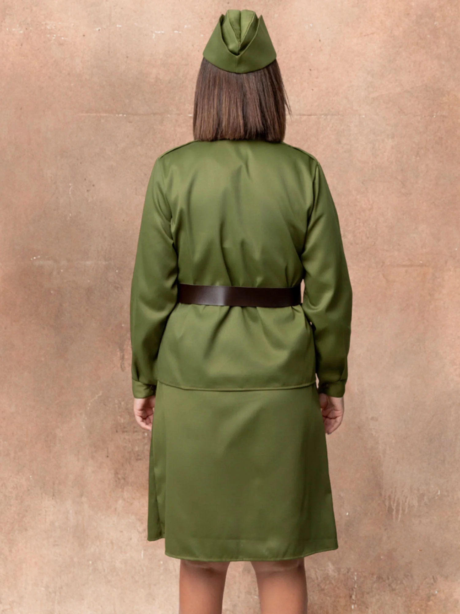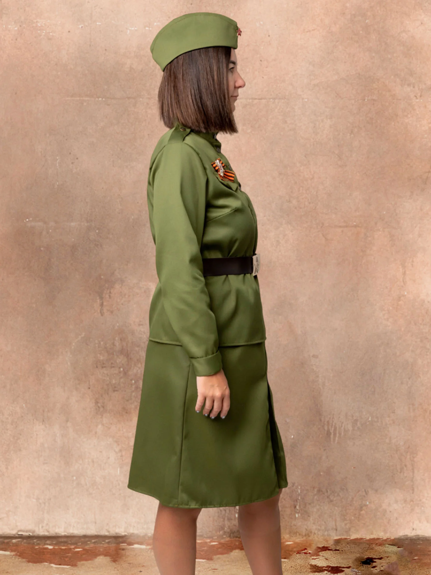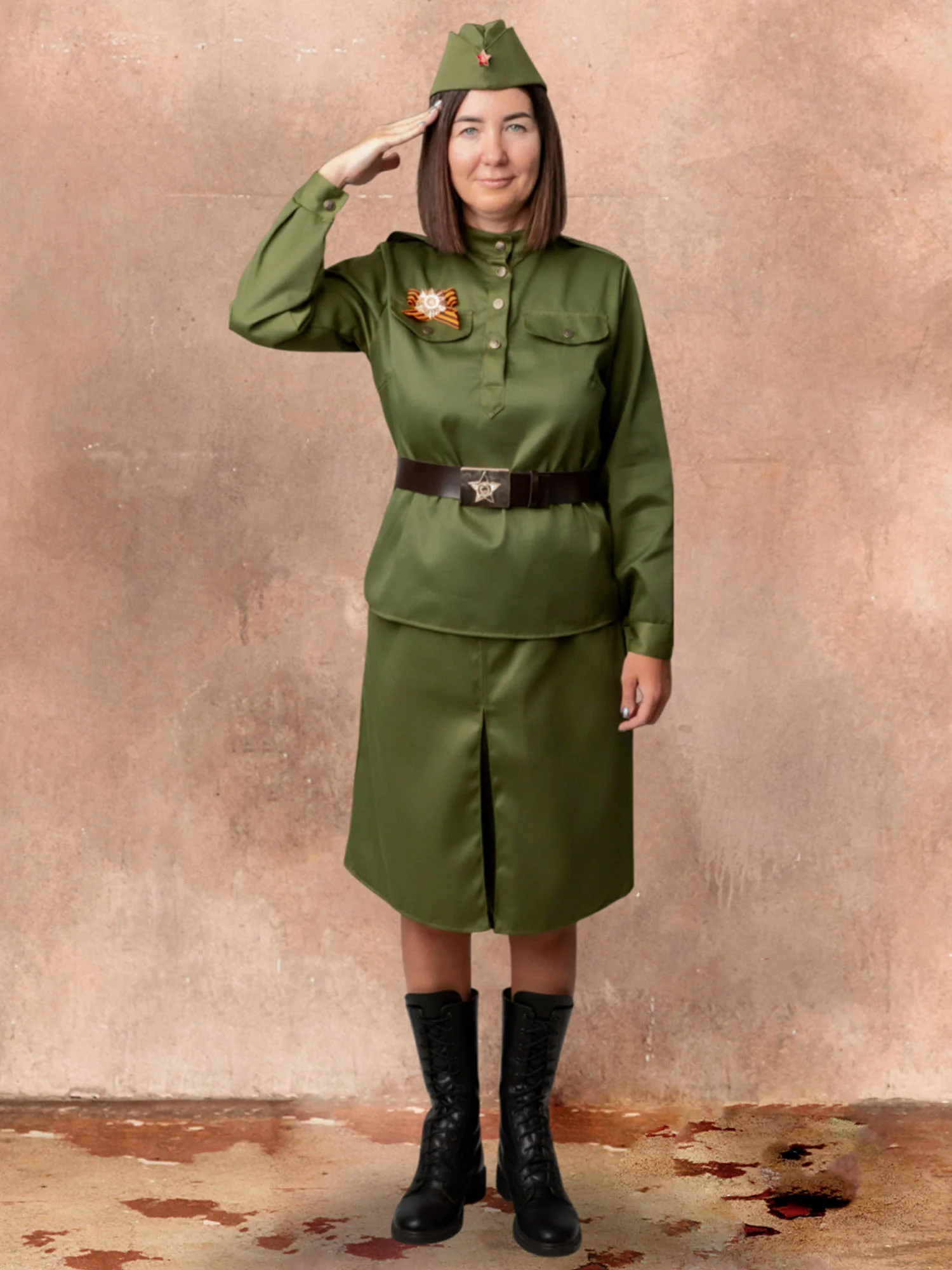 Костюм Солдатки женский – стилизованный под советскую военную форму образ на 9 мая. Костюм Солдатки взрослый подойдет для выступлений, шествий Бессмертного полка, спектаклей и других мероприятий. Комплект костюма состоит из гимнастерки, юбки, ремня, пилотки, значка и георгиевской ленточки.