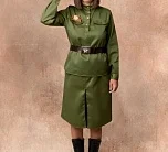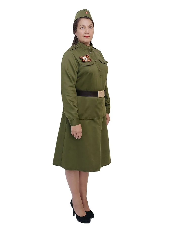 Костюм Солдатки женский – стилизованный под советскую военную форму образ на 9 мая. Костюм Солдатки взрослый подойдет для выступлений, шествий Бессмертного полка, спектаклей и других мероприятий. Комплект костюма состоит из гимнастерки, юбки, ремня, пилотки, значка и георгиевской ленточки.