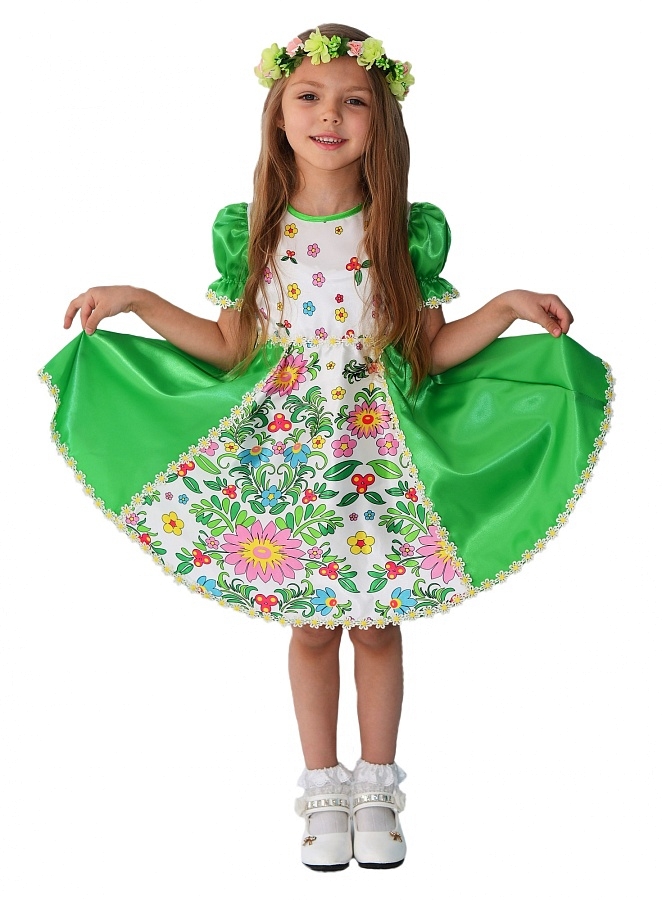 В этом образе мы постарались сплести воедино народные и сказочные мотивы, создать карнавальный костюм, который украсит любой праздник. Весна подойдет для утренников, спектаклей, празднования Масленицы и других мероприятий. Помимо платья, комплект костюма дополняет красивый ободок.
