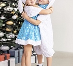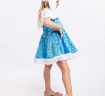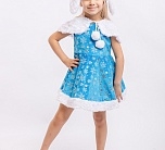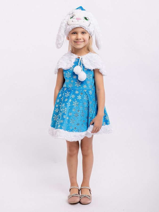 Карнавальный костюм Зайка Зоя для девочки 3-5 лет. В комплекте платье, пелерина, шапка. Очаровательный наряд для новогоднего праздника и спектакля в детском саду или кружке. Платье голубого цвета украшено блестящими узорами в виде снежинок.