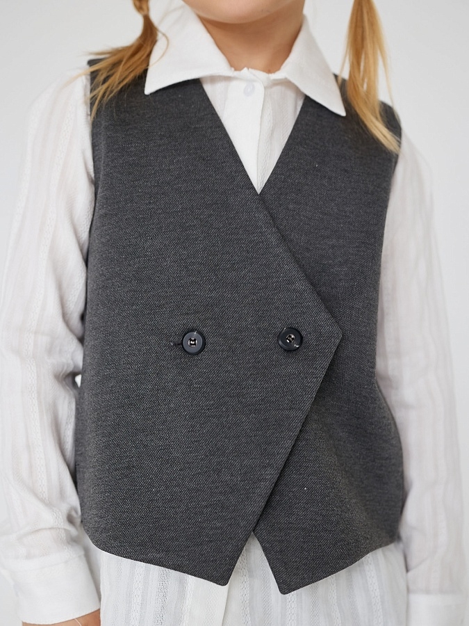 Жилет для девочки прилегающего силуэта с центральной двубортной застёжкой на петли и пуговицы. Декоративная вставка в виде молний по рельефному шву переда. На спинке хлястик с утяжкой через пряжку. Выполнен из однотонного смесового трикотажа. Удобные карманы в боковых швах.