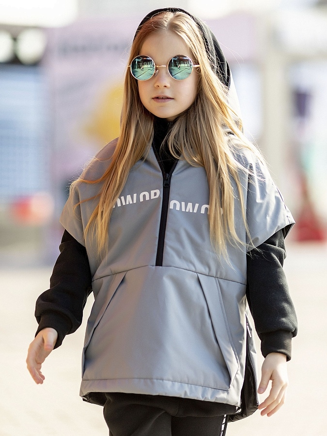 Жилет-анорак Кью из новой коллекции Осень 2022 от бренда детской одежды batik. Утепленный жилет серого цвета с надписью на груди, капюшоном и застежкой-молнией. Можно надевать поверх толстовки или кофты. Имеет удлиненную спинку и разрезы по бокам.