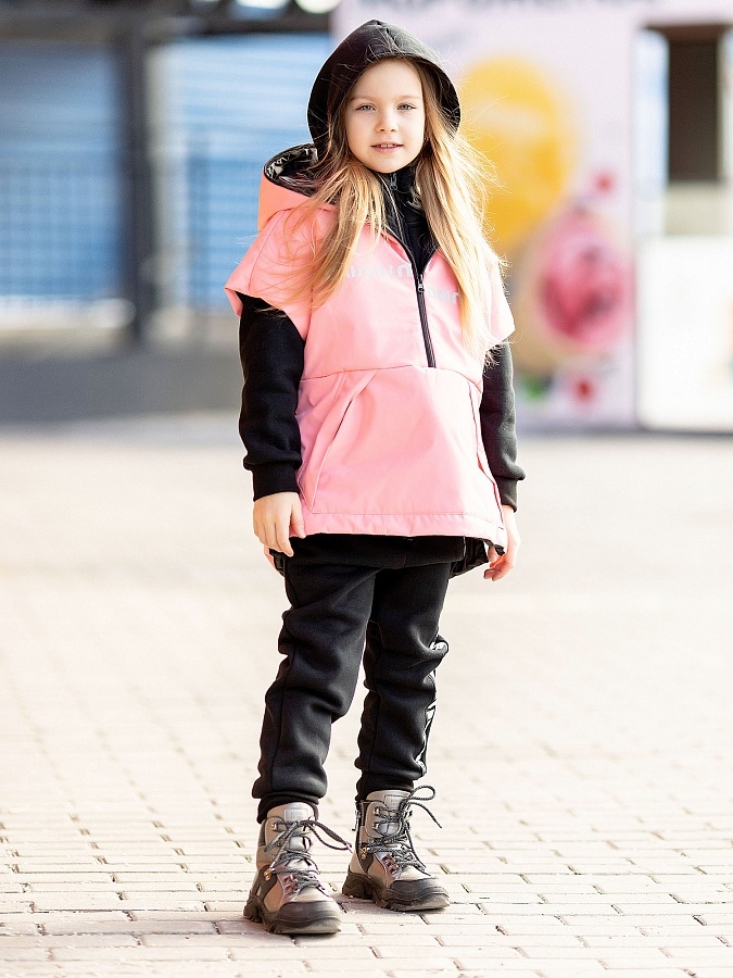 Жилет-анорак Кью из новой коллекции Осень 2022 от бренда детской одежды batik. Утепленный жилет розового цвета с надписью на груди, капюшоном и застежкой-молнией. Можно надевать поверх толстовки или кофты. Имеет удлиненную спинку и разрезы по бокам.
