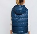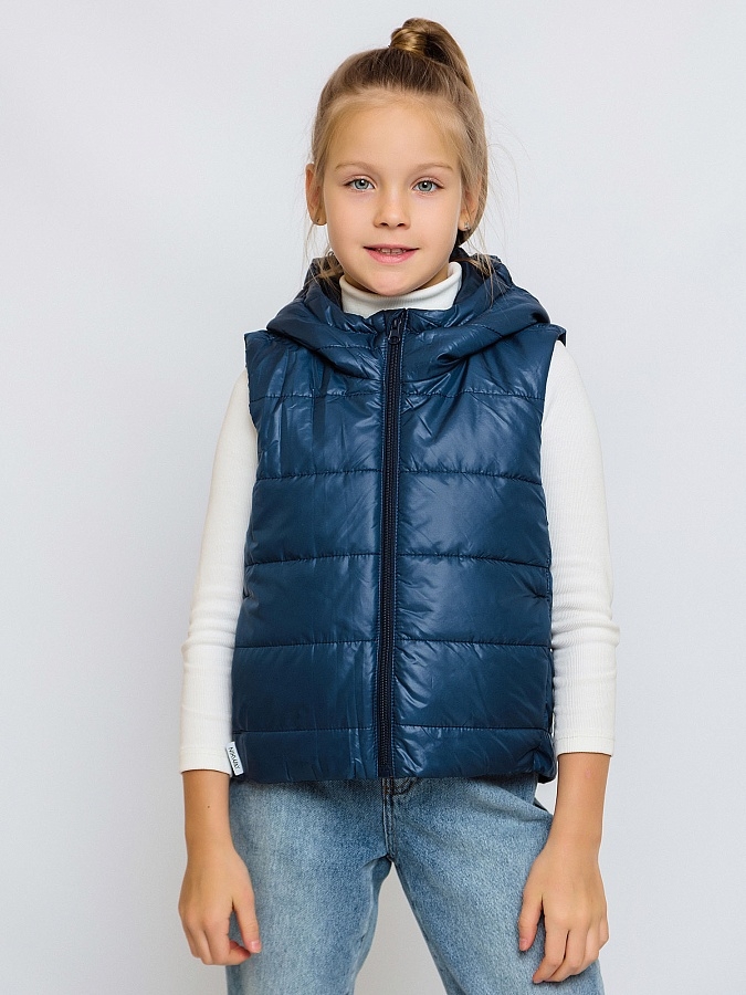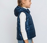 Жилет Эш для детей утепленный на молнии с капюшоном. Демисезонная детская жилетка – идеальный вариант в детском гардеробе как на осень или весну, так и на прохладное лето. Выполнен в синем цвете из глянцевой курточной ткани.