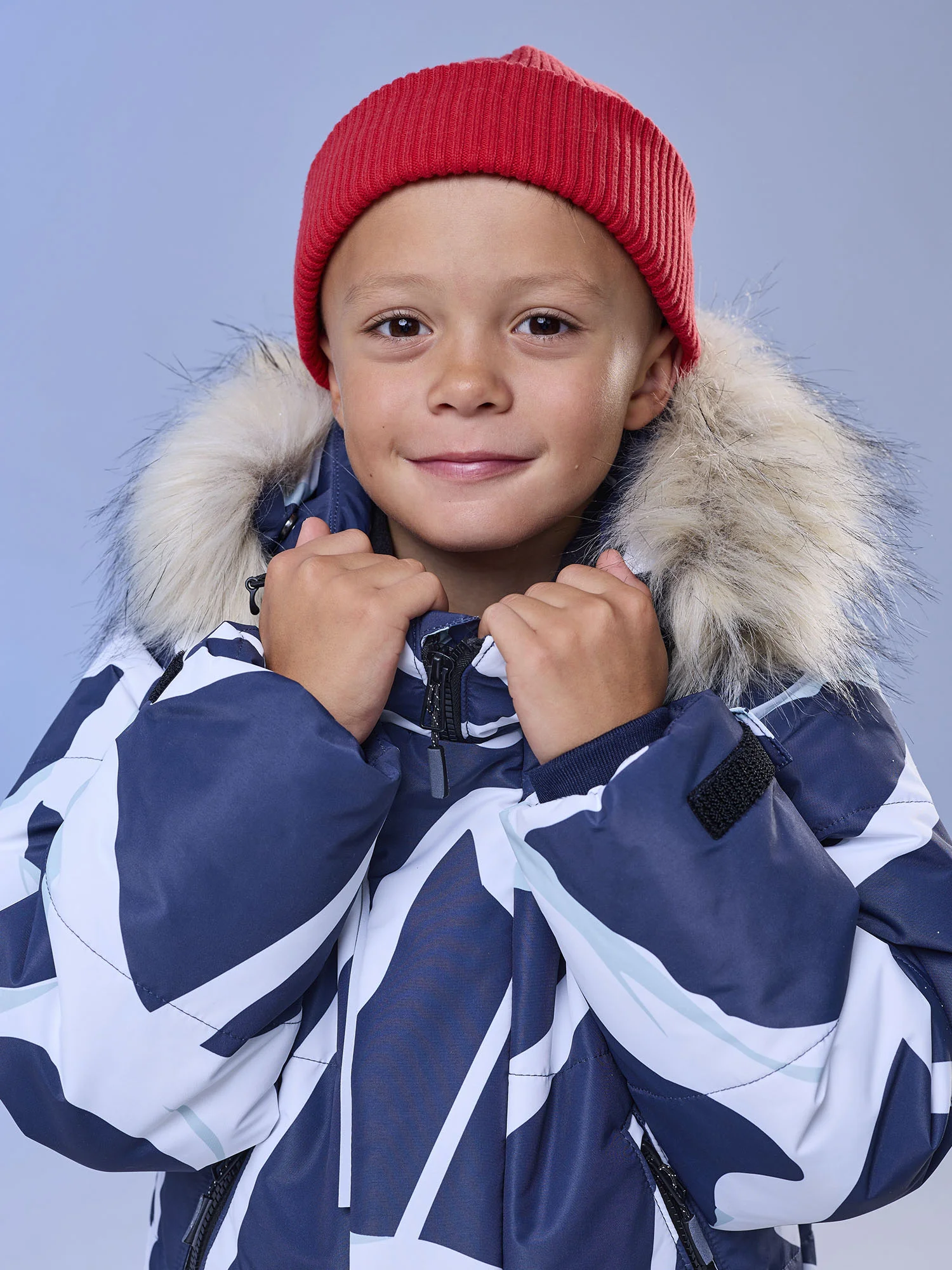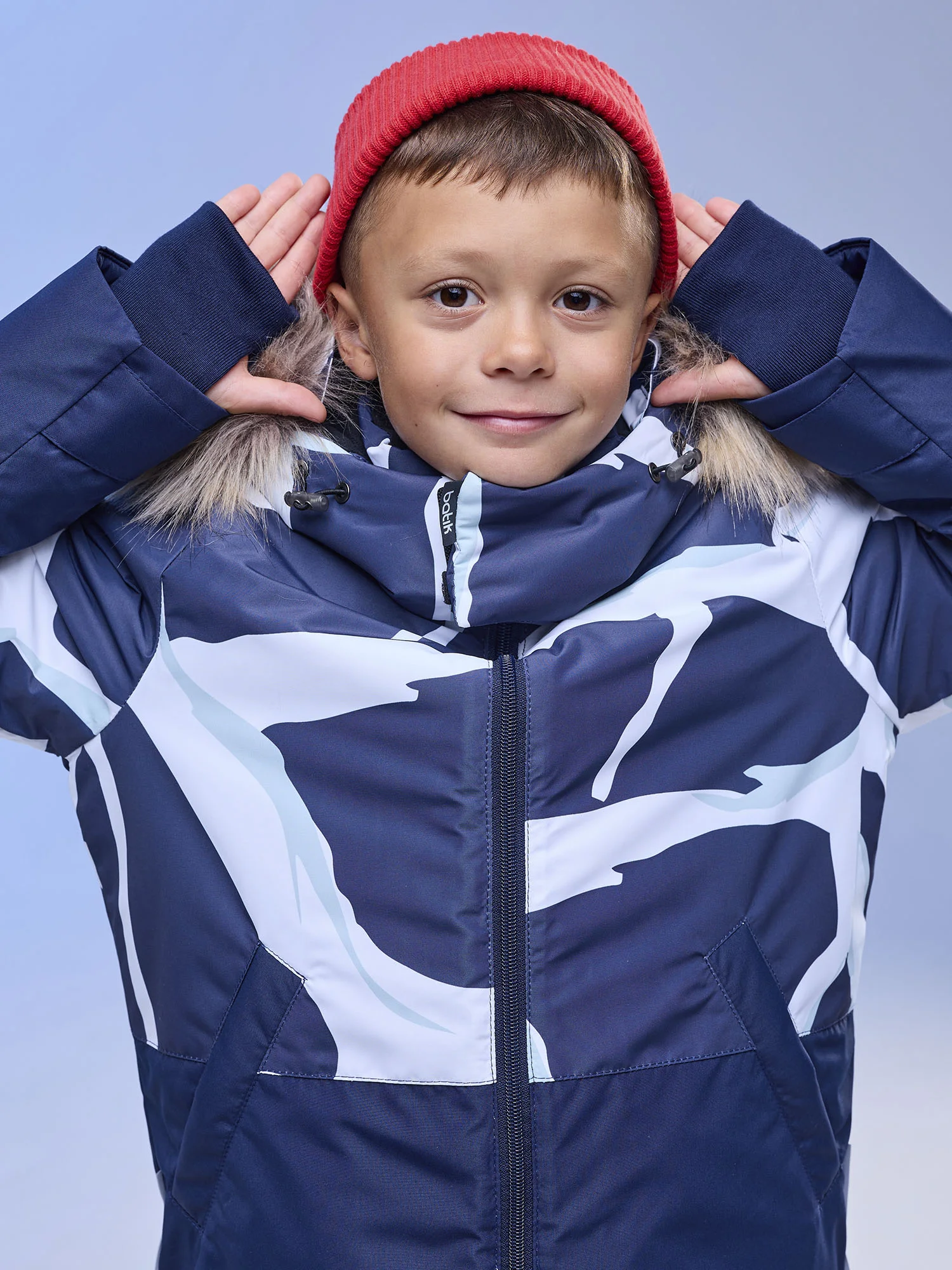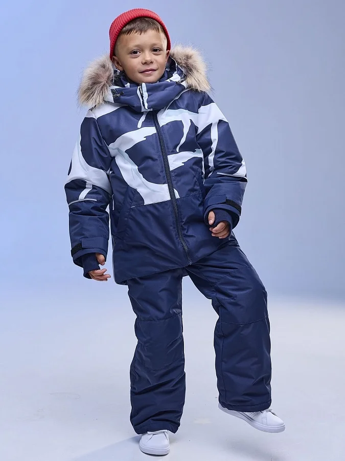 Комплект для мальчика "Дерек" с графичным синим принтом — это выбор активных детей. Яркий дизайн мембранной ткани сочетает в себе спортивный характер и городской стиль, идеально подходя для зимних приключений.